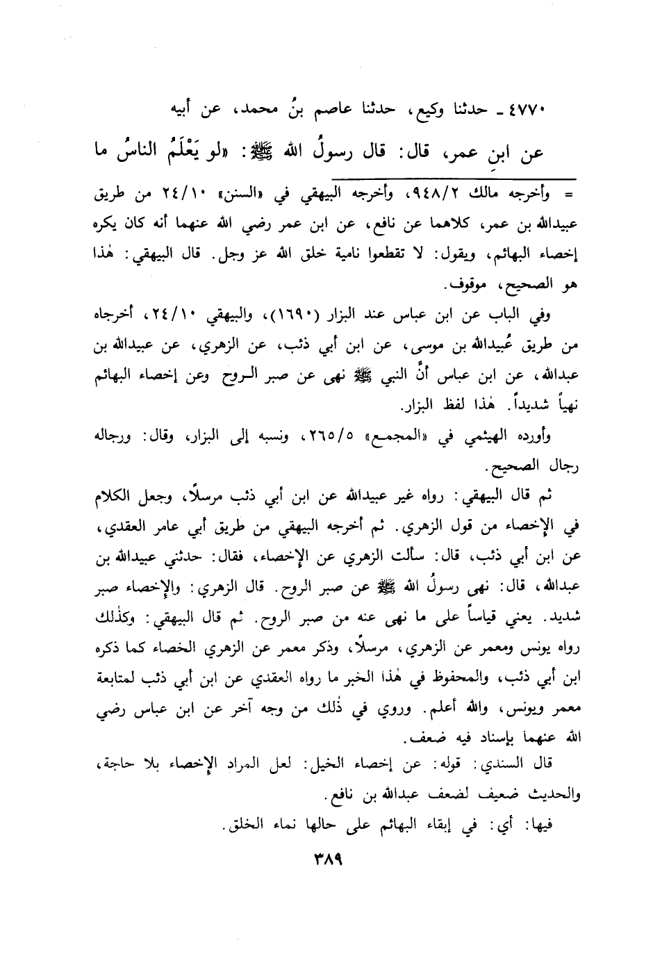 ثم قال البيهقي: رواه غير عبيد الله عن ابن أبي ذئب مرسلا، وجعل الكلام في الإخصاء من قول الزهري. ثم أخرجه البيهقي من طريق أبي عامر العقدي، عن ابن أبى ذئب، قال: سألت الزهري عن الإخصاء، فقال: حدثني عبيد الله بن عبد الله، قال: نهى رسولُ الله صَلَّى اللهُ عَلَيْهِ وَسَلَّمَ عن صبر الروح ثم قال البيهقي: والإخصاء صبر شديد. يعنى قياساً على ما نهى عنه من صبر الروح. ثم قال البيهقي: وكذلك رواه يونس ومعمر عن الزهري، مرسلاً، وذكر معمر عن الزهري الخصاء كما ذكره ابن أبي ذئب، والمحفوظ في هذا الخبر ما رواه العقدي عن ابن أبي ذئب لمتابعة معمر ويونس، والله أعلم. وروي في ذلك من وجه آخر عن ابن عباس رضي الله عنهما بإسناد فيه ضعف.