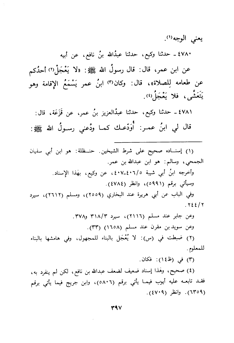 ٤٧٨٠ - حَدَّثَنَا وَكِيعٌ، حَدَّثَنَا عَبْدُ اللهِ بْنُ نَافِعٍ، عَنْ أَبِيهِ، عَنِ ابْنِ عُمَرَ قَالَ: قَالَ رَسُولُ اللهِ صَلَّى اللهُ عَلَيْهِ وَسَلَّمَ: " لَا يَعْجَلْ (٢) أَحَدُكُمْ عَنْ طَعَامِهِ لِلصَّلَاةِ "، قَالَ: وَكَانَ (٣) ابْنُ عُمَرَ يَسْمَعُ الْإِقَامَةَ وَهُوَ يَتَعَشَّى فَلَا يَعْجَلُ (٤)