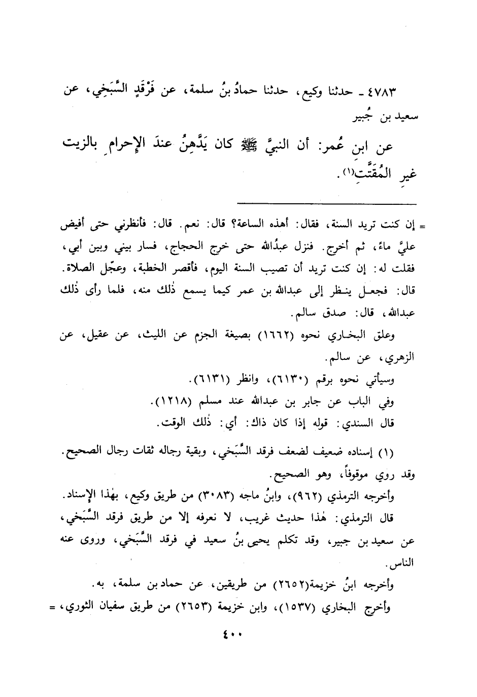 ٤٧٨٣ - حَدَّثَنَا وَكِيعٌ، حَدَّثَنَا حَمَّادُ بْنُ سَلَمَةَ، عَنْ فَرْقَدٍ السَّبَخِيِّ، عَنْ سَعِيدِ بْنِ جُبَيْرٍ، عَنِ ابْنِ عُمَرَ، " أَنَّ النَّبِيَّ صَلَّى اللهُ عَلَيْهِ وَسَلَّمَ كَانَ يَدَّهِنُ عِنْدَ الْإِحْرَامِ بِالزَّيْتِ غَيْرَ الْمُقَتَّتِ " (١)