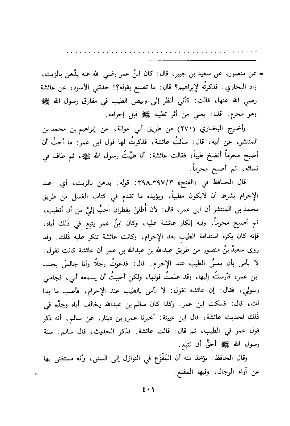 =عن منصور، عن سعيد بن جبير، قال: كان ابن عمر رضي الله عنه يدَّهن بالزيت، زاد البخاري: فذكرتُه لإبراهيم؟ قال: ما تصنع بقوله؟ حدثني الأسود، عن عائشة رضي الله عنها، قالت: كأني أنظر إلى وبيص الطيب في مفارق رسول الله صَلَّى اللهُ عَلَيْهِ وَسَلَّمَ وهو محرم. قلنا: يعني من أثر تطيبه صَلَّى اللهُ عَلَيْهِ وَسَلَّمَ قبل إحرامه.