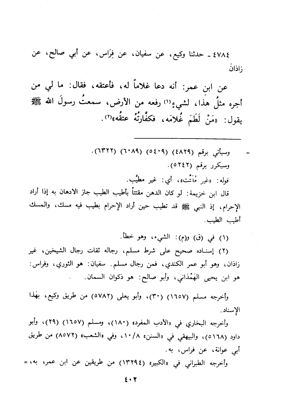 ٤٧٨٤ - حَدَّثَنَا وَكِيعٌ، عَنْ سُفْيَانَ، عَنْ فِرَاسٍ، عَنْ أَبِي صَالِحٍ، عَنْ زَاذَانَ، عَنِ ابْنِ عُمَرَ، أَنَّهُ دَعَا غُلَامًا لَهُ فَأَعْتَقَهُ. فَقَالَ: مَا لِي مِنْ أَجْرِهِ مِثْلُ هَذَا لِشَيْءٍ (١) رَفَعَهُ مِنَ الْأَرْضِ، سَمِعْتُ رَسُولَ اللهِ صَلَّى اللهُ عَلَيْهِ وَسَلَّمَ يَقُولُ: " مَنْ لَطَمَ غُلَامَهُ، فَكَفَّارَتُهُ عِتْقُهُ " (٢)