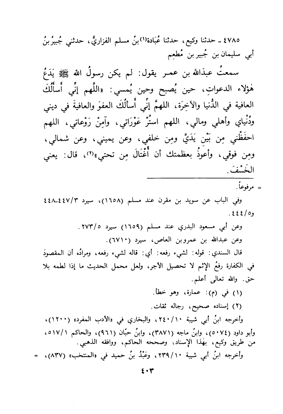 ٤٧٨٥ - حَدَّثَنَا وَكِيعٌ، حَدَّثَنَا عُبَادَةُ (١) بْنُ مُسْلِمٍ الْفَزَارِيُّ، حَدَّثَنِي جُبَيْرُ بْنُ أَبِي سُلَيْمَانَ بْنِ جُبَيْرِ بْنِ مُطْعِمٍ، سَمِعْتُ عَبْدَ اللهِ بْنَ عُمَرَ يَقُولُ: لَمْ يَكُنْ رَسُولُ اللهِ صَلَّى اللهُ عَلَيْهِ وَسَلَّمَ يَدَعُ هَؤُلَاءِ الدَّعَوَاتِ حِينَ يُصْبِحُ وَحِينَ يُمْسِي: " اللهُمَّ إِنِّي أَسْأَلُكَ الْعَافِيَةَ فِي الدُّنْيَا وَالْآخِرَةِ، اللهُمَّ إِنِّي أَسْأَلُكَ الْعَفْوَ وَالْعَافِيَةَ فِي دِينِي وَدُنْيَايَ وَأَهْلِي وَمَالِي، اللهُمَّ اسْتُرْ عَوْرَاتِي، وَآمِنْ رَوْعَاتِي، اللهُمَّ احْفَظْنِي مِنْ بَيْنِ يَدَيَّ، وَمِنْ خَلْفِي، وَعَنْ يَمِينِي، وَعَنْ شِمَالِي، وَمِنْ فَوْقِي، وَأَعُوذُ بِعَظَمَتِكَ أَنْ أُغْتَالَ مِنْ تَحْتِي "، (٢) قَالَ: يَعْنِي الْخَسْفَ