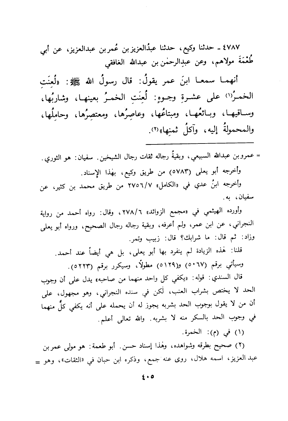 ٤٧٨٧ - حَدَّثَنَا وَكِيعٌ، حَدَّثَنَا عَبْدُ الْعَزِيزِ بْنُ عُمَرَ بْنِ عَبْدِ الْعَزِيزِ، عَنْ أَبِي طُعْمَةَ، مَوْلَاهُمْ، وَعَنْ عَبْدِ الرَّحْمَنِ بْنِ عَبْدِ اللهِ الْغَافِقِيِّ، أَنَّهُمَا سَمِعَا ابْنَ عُمَرَ يَقُولُ: قَالَ رَسُولُ اللهِ صَلَّى اللهُ عَلَيْهِ وَسَلَّمَ: " لُعِنَتِ الْخَمْرُ (١) عَلَى عَشْرَةِ وُجُوهٍ: لُعِنَتِ الْخَمْرُ بِعَيْنِهَا، وَشَارِبُهَا، وَسَاقِيهَا، وَبَائِعُهَا، وَمُبْتَاعُهَا، وَعَاصِرُهَا، وَمُعْتَصِرُهَا، وَحَامِلُهَا، وَالْمَحْمُولَةُ إِلَيْهِ، وَآكِلُ ثَمَنِهَا " (٢)
