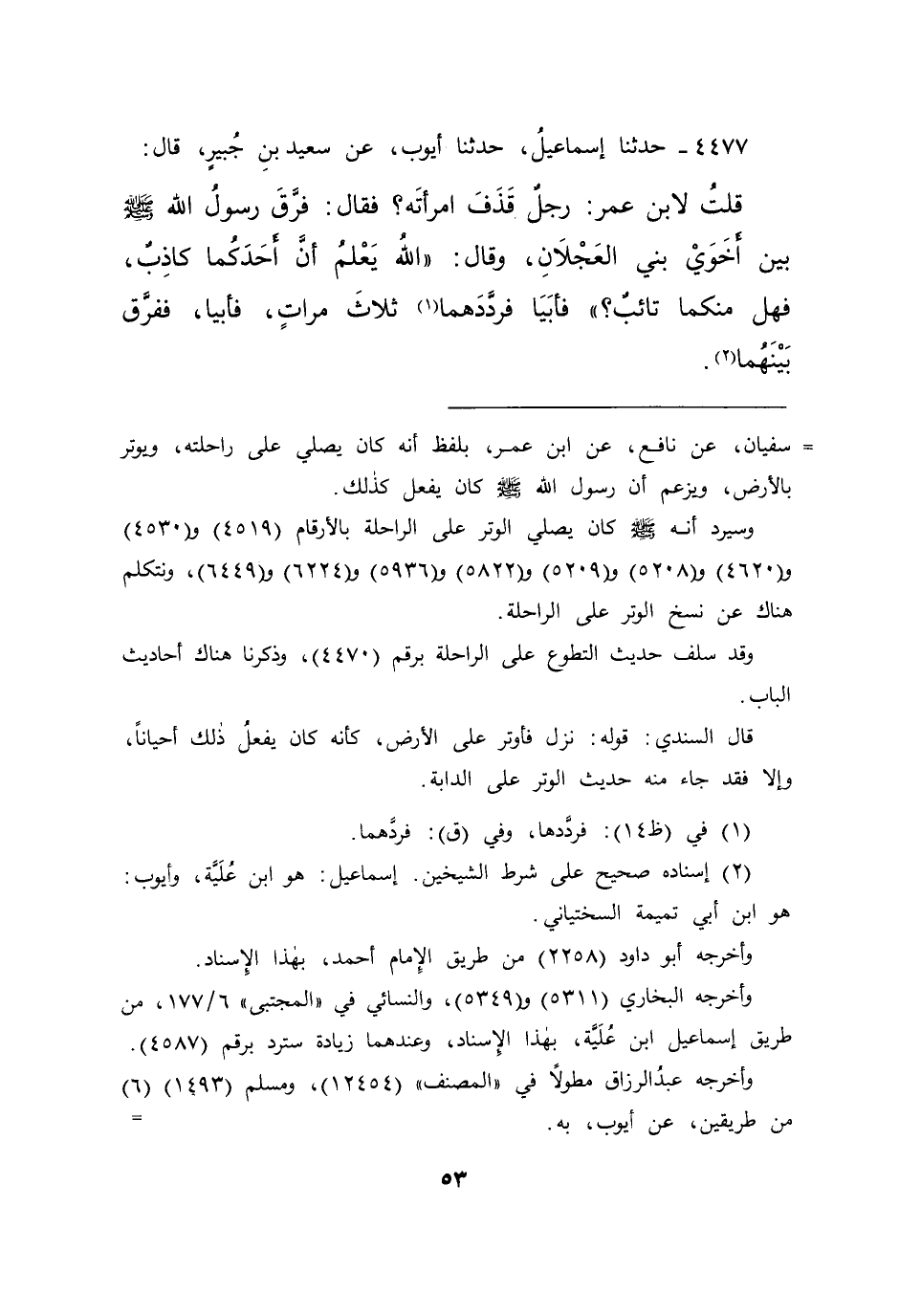 ٤٤٧٧ - حَدَّثَنَا إِسْمَاعِيلُ، حَدَّثَنَا أَيُّوبُ، عَنْ سَعِيدِ بْنِ جُبَيْرٍ، قَالَ: قُلْتُ لِابْنِ عُمَرَ: رَجُلٌ قَذَفَ امْرَأَتَهُ فَقَالَ: فَرَّقَ رَسُولُ اللهِ صَلَّى اللهُ عَلَيْهِ وَسَلَّمَ بَيْنَ أَخَوَيْ بَنِي الْعَجْلَانِ، وَقَالَ: " اللهُ يَعْلَمُ أَنَّ أَحَدَكُمَا كَاذِبٌ، فَهَلْ مِنْكُمَا تَائِبٌ؟ " فَأَبَيَا فَرَدَّدَهُمَا (١) ثَلَاثَ مَرَّاتٍ، فَأَبَيَا، فَفَرَّقَ بَيْنَهُمَا (٢)
