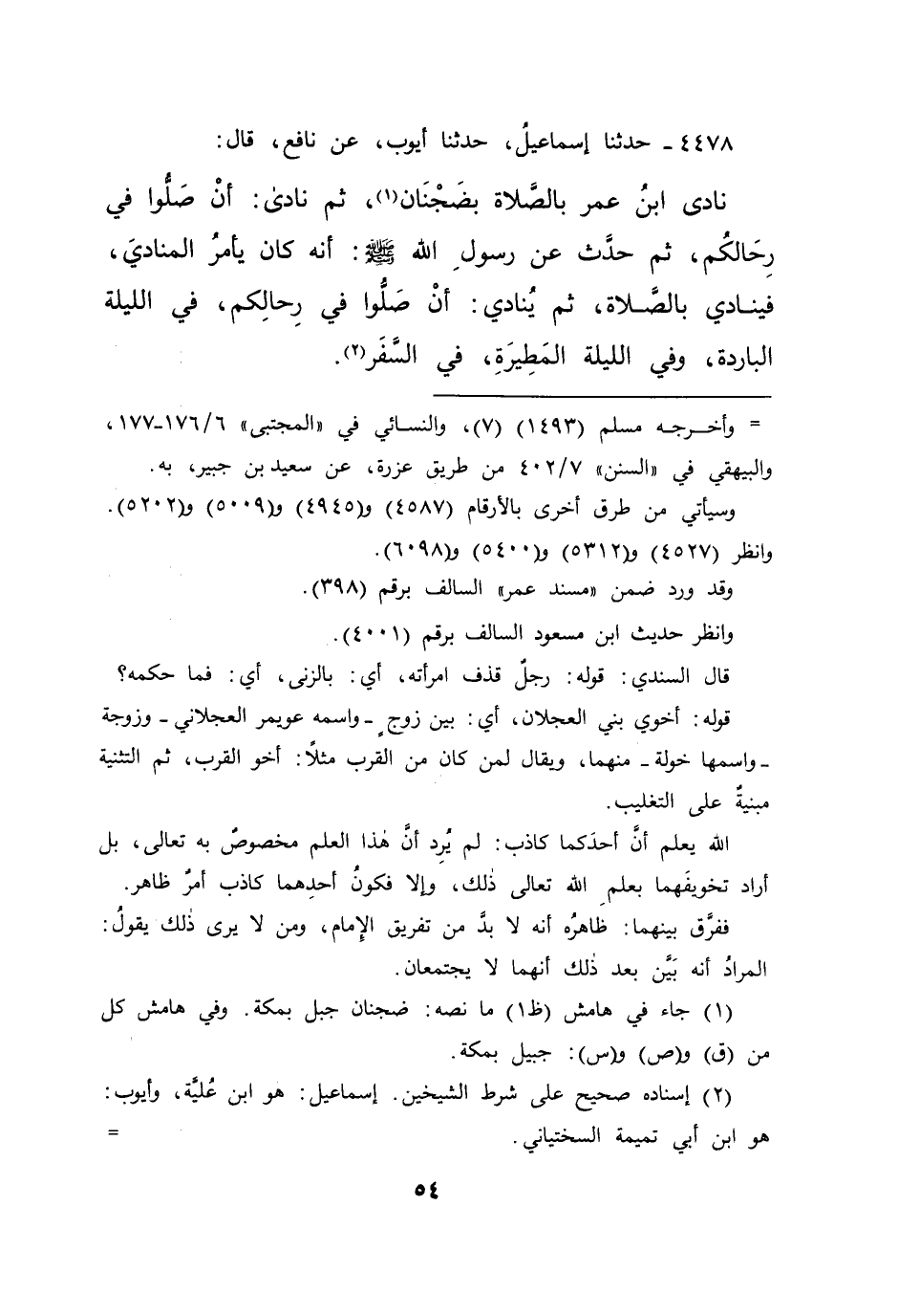 ٤٤٧٨ - حَدَّثَنَا إِسْمَاعِيلُ، حَدَّثَنَا أَيُّوبُ، عَنْ نَافِعٍ، قَالَ: نَادَى ابْنُ عُمَرَ بِالصَّلَاةِ بِضَجْنَانَ، (١) ثُمَّ نَادَى: أَنْ صَلُّوا فِي رِحَالِكُمْ، ثُمَّ حَدَّثَ عَنْ رَسُولِ اللهِ صَلَّى اللهُ عَلَيْهِ وَسَلَّمَ: " أَنَّهُ كَانَ يَأْمُرُ الْمُنَادِيَ، فَيُنَادِي بِالصَّلَاةِ، ثُمَّ يُنَادِي: أَنْ صَلُّوا فِي رِحَالِكُمْ، فِي اللَّيْلَةِ الْبَارِدَةِ، وَفِي اللَّيْلَةِ الْمَطِيرَةِ، فِي السَّفَرِ " (٢)