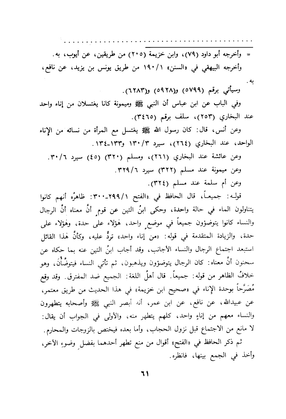 وعن أنس، قال: كان رسول الله صَلَّى اللهُ عَلَيْهِ وَسَلَّمَ يغتسل مع المرأة من نسائه من الإناء الواحد، عند البخاري (٢٦٤) ، سيرد ٣/١٣٠ و١٣٣-١٣٤.