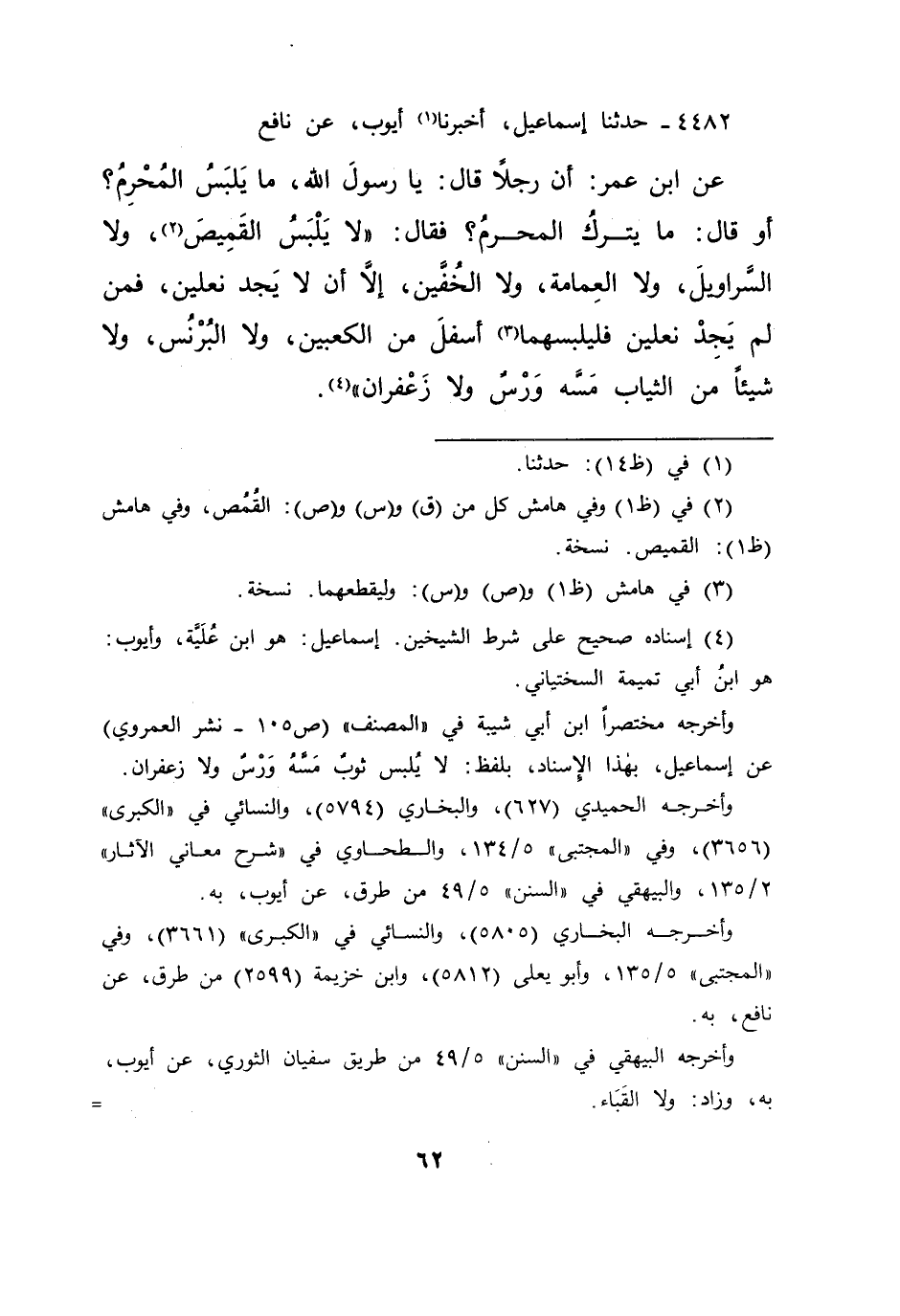٤٤٨٢ - حَدَّثَنَا إِسْمَاعِيلُ، أَخْبَرَنَا (١) أَيُّوبُ، عَنْ نَافِعٍ، عَنِ ابْنِ عُمَرَ، أَنَّ رَجُلًا قَالَ: يَا رَسُولَ اللهِ، مَا يَلْبَسُ الْمُحْرِمُ؟ أَوْ قَالَ: مَا يَتْرُكُ الْمُحْرِمُ؟ فَقَالَ: " لَا يَلْبَسُ الْقَمِيصَ، (٢) وَلَا السَّرَاوِيلَ، وَلَا الْعِمَامَةَ، وَلَا الْخُفَّيْنِ، إِلَّا أَنْ لَا يَجِدَ نَعْلَيْنِ، فَمَنْ لَمْ يَجِدْ نَعْلَيْنِ فَلْيَلْبَسْهُمَا (٣) أَسْفَلَ مِنَ الْكَعْبَيْنِ، وَلَا الْبُرْنُسَ، وَلَا شَيْئًا مِنَ الثِّيَابِ مَسَّهُ، وَرْسٌ، وَلَا زَعْفَرَانٌ " (٤)