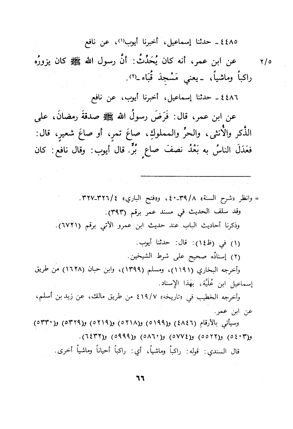 ٤٤٨٥ - حَدَّثَنَا إِسْمَاعِيلُ، أَخْبَرَنَا أَيُّوبُ (١) ، عَنْ نَافِعٍ، عَنِ ابْنِ عُمَرَ، أَنَّهُ كَانَ يُحَدِّثُ: " أَنَّ رَسُولَ اللهِ صَلَّى اللهُ عَلَيْهِ وَسَلَّمَ كَانَ يَزُورُهُ رَاكِبًا وَمَاشِيًا، - يَعْنِي مَسْجِدَ قُبَاءَ - " (٢)