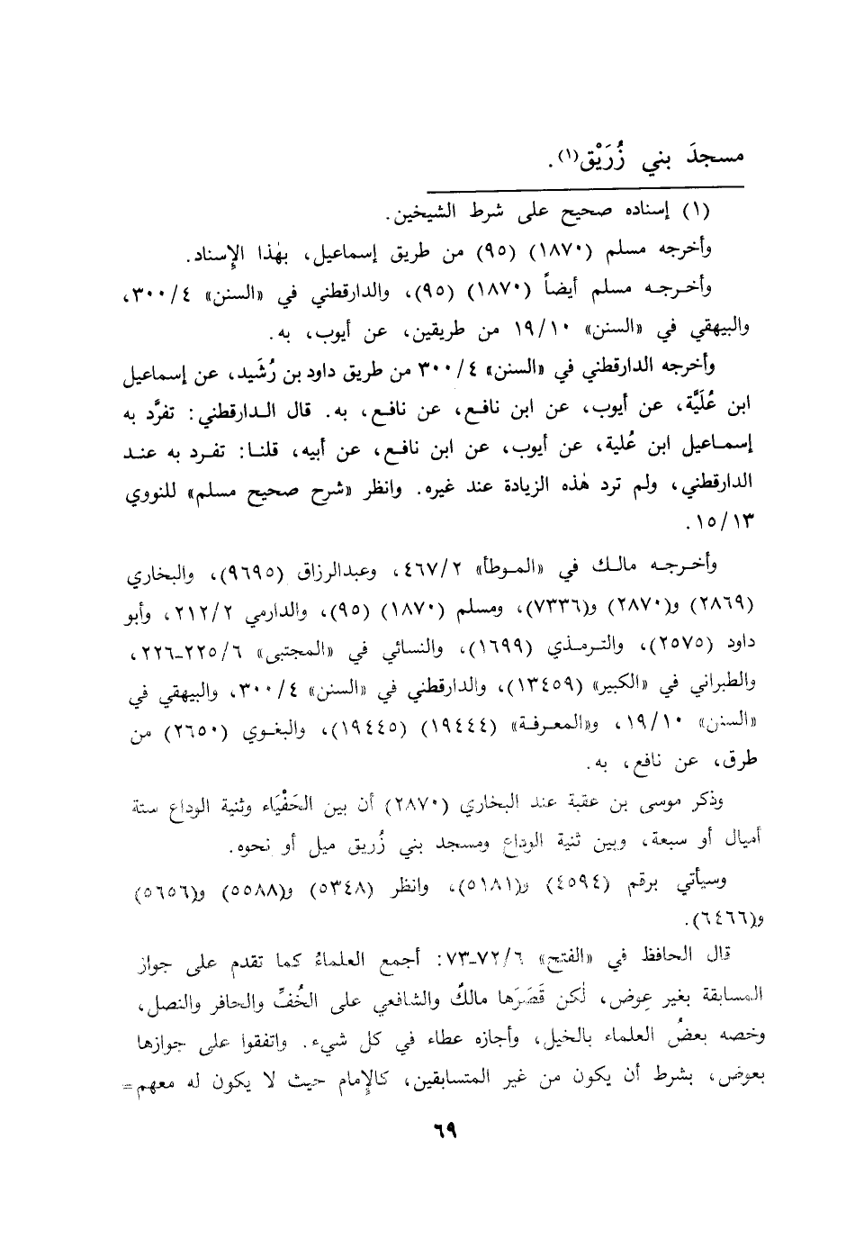 وقال الحافظ فى "الفتح" ٦/٧٢ - ٧٣: أجمع العلماء كما تقدم على جواز المسابقة بغير عوض لكن قصرها مالك والشافعي على الخف والحافر والنصل وخصه بعض العلماء بالخيل وأجازه عطاء فى كل شيء واتفقوا على جوازها بعوض بشرط أن يكون من غير المتسابقين كالإمام حيث لا يكون له معهم=