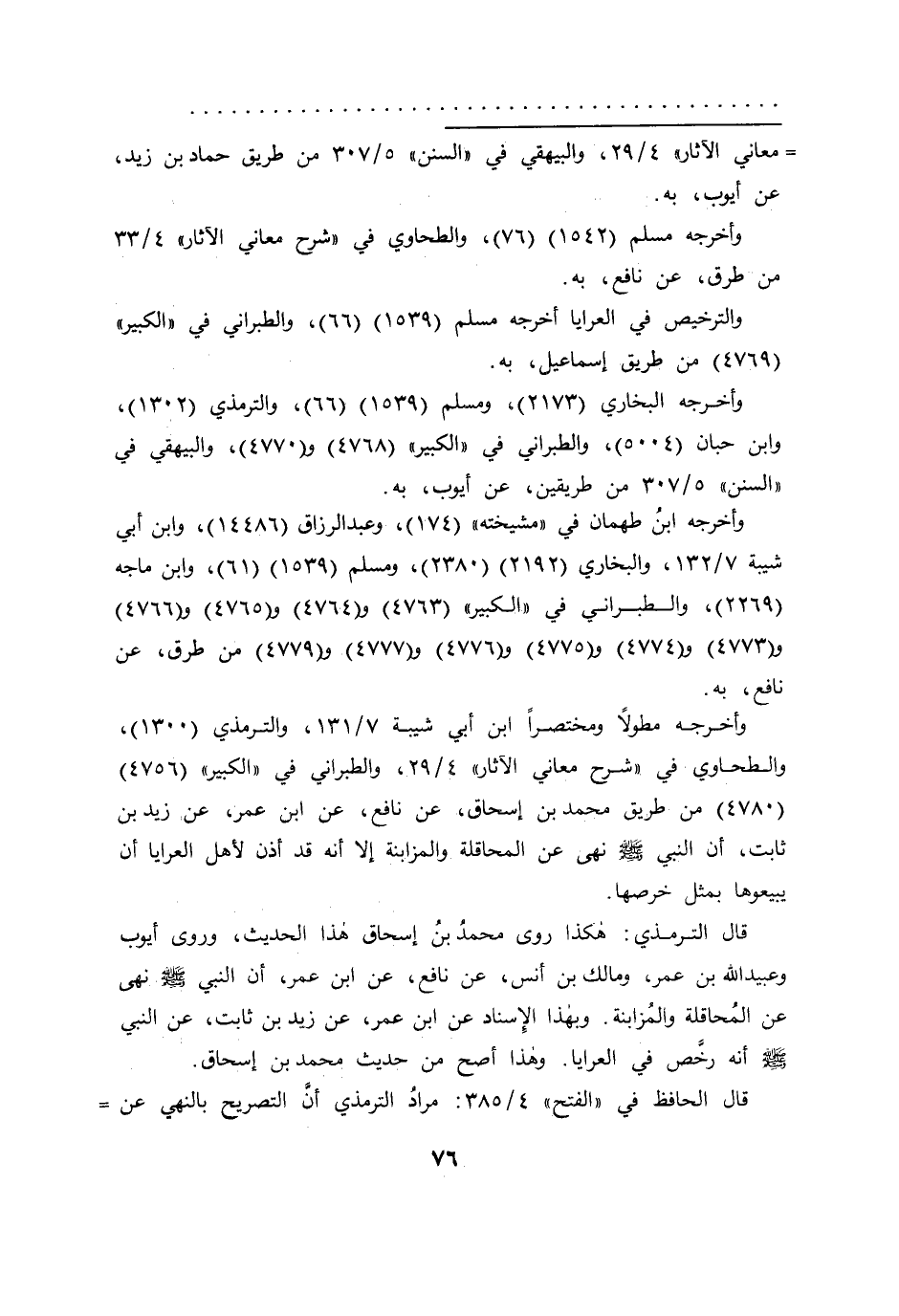 قال الترمذي: هكذا روى محمدُ بنُ إسحاق هذا الحديث، وروى أيوب وعبيد الله بن عمر، ومالك بن أنس، عن نافع، عن ابن عمر، أن النبي صَلَّى اللهُ عَلَيْهِ وَسَلَّمَ نهى عن المُحاقلة والمُزابنة. وبهذا الإسناد عن ابن عمر، عن زيد بن ثابت، عن النبي صَلَّى اللهُ عَلَيْهِ وَسَلَّمَ أنه رخًص في العرايا. وهذا أصح من حديث محمد بن إسحاق.