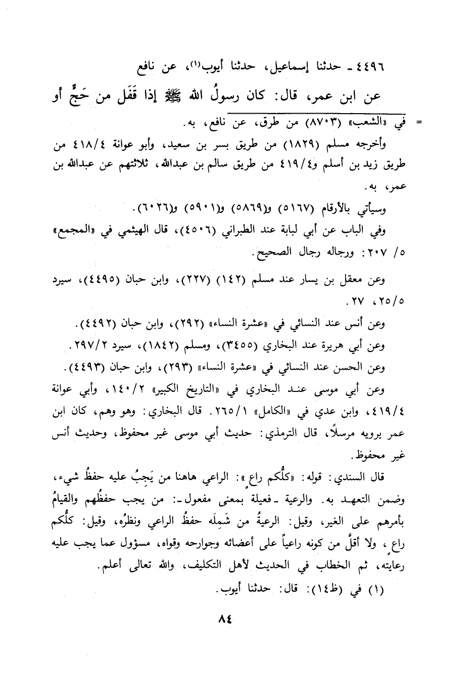 ٤٤٩٦ - حَدَّثَنَا إِسْمَاعِيلُ، حَدَّثَنَا أَيُّوبُ، (١) عَنْ نَافِعٍ، عَنْ ابْنِ عُمَرَ، قَالَ: كَانَ رَسُولُ اللهِ صَلَّى اللهُ عَلَيْهِ وَسَلَّمَ: إِذَا قَفَلَ مِنْ حَجٍّ أَوْ