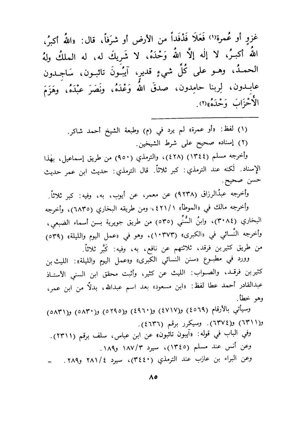 غَزْوٍ أَوْ عُمْرَةٍ (١) فَعَلَا فَدْفَدًا منَ الْأَرْضِ، أَوْ شَرَفًا، قَالَ: " اللهُ أَكْبَرُ، اللهُ أَكْبَرُ، لَا إِلَهَ إِلَّا اللهُ وَحْدَهُ، لَا شَرِيكَ لَهُ، لَهُ الْمُلْكُ وَلَهُ الْحَمْدُ، وَهُوَ عَلَى كُلِّ شَيْءٍ قَدِيرٌ، آيِبُونَ تَائِبُونَ، سَاجِدُونَ عَابِدُونَ، لِرَبِّنَا حَامِدُونَ، صَدَقَ اللهُ وَعْدَهُ، وَنَصَرَ عَبْدَهُ، وَهَزَمَ الْأَحْزَابَ، وَحْدَهُ " (٢)