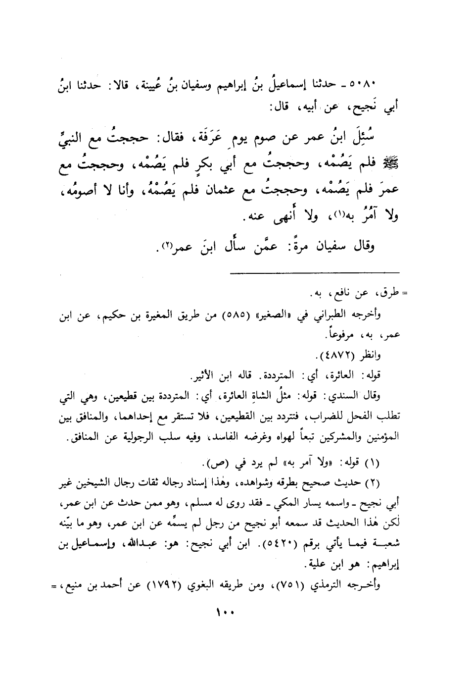 ٥٠٨٠ - حَدَّثَنَا إِسْمَاعِيلُ بْنُ إِبْرَاهِيمَ، وَسُفْيَانُ بْنُ عُيَيْنَةَ، قَالَا: حَدَّثَنَا ابْنُ أَبِي نَجِيحٍ، عَنْ أَبِيهِ قَالَ: سُئِلَ ابْنُ عُمَرَ عَنْ صَوْمِ يَوْمِ عَرَفَةَ فَقَالَ: " حَجَجْتُ مَعَ النَّبِيِّ صَلَّى اللهُ عَلَيْهِ وَسَلَّمَ فَلَمْ يَصُمْهُ "، وَحَجَجْتُ مَعَ أَبِي بَكْرٍ فَلَمْ يَصُمْهُ، وَحَجَجْتُ مَعَ عُمَرَ فَلَمْ يَصُمْهُ، وَحَجَجْتُ مَعَ عُثْمَانَ فَلَمْ يَصُمْهُ، وَأَنَا لَا أَصُومُهُ وَلَا آمُرُ بِهِ (١) وَلَا أَنْهَى عَنْهُ، وَقَالَ سُفْيَانُ مَرَّةً عَمَّنْ سَأَلَ ابْنَ عُمَرَ (٢)