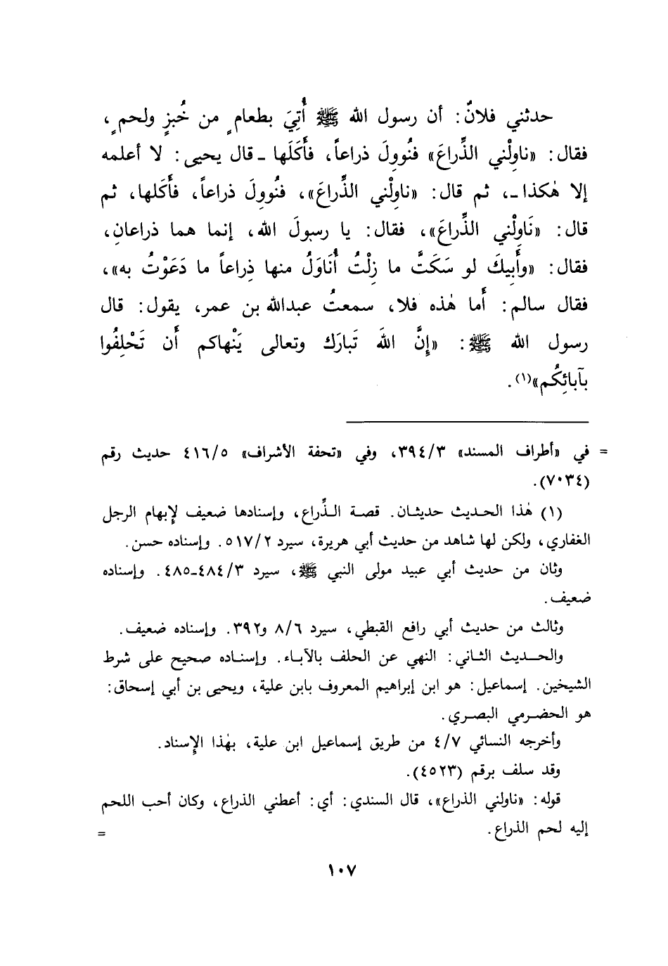حَدَّثَنِي فُلَانٌ، أَنَّ رَسُولَ اللهِ صَلَّى اللهُ عَلَيْهِ وَسَلَّمَ أُتِيَ بِطَعَامٍ مِنْ خُبْزٍ وَلَحْمٍ فَقَالَ: " نَاوِلْنِي الذِّرَاعَ "، فَنُووِلَ ذِرَاعًا، فَأَكَلَهَا، - قَالَ يَحْيَى: لَا أَعْلَمُهُ إِلَّا هَكَذَا ثُمَّ - قَالَ: " نَاوِلْنِي الذِّرَاعَ "، فَنُووِلَ ذِرَاعًا، فَأَكَلَهَا، ثُمَّ قَالَ: " نَاوِلْنِي الذِّرَاعَ " فَقَالَ: يَا رَسُولَ اللهِ، إِنَّمَا هُمَا ذِرَاعَانِ فَقَالَ: " وَأَبِيكَ لَوْ سَكَتَّ مَا زِلْتُ أُنَاوَلُ مِنْهَا ذِرَاعًا مَا دَعَوْتُ بِهِ " فَقَالَ سَالِمٌ: أَمَّا هَذِهِ فَلَا سَمِعْتُ عَبْدَ اللهِ بْنَ عُمَرَ يَقُولُ: قَالَ رَسُولُ اللهِ صَلَّى اللهُ عَلَيْهِ وَسَلَّمَ: " إِنَّ اللهَ تَبَارَكَ وَتَعَالَى يَنْهَاكُمْ أَنْ تَحْلِفُوا بِآبَائِكُمْ " (١)