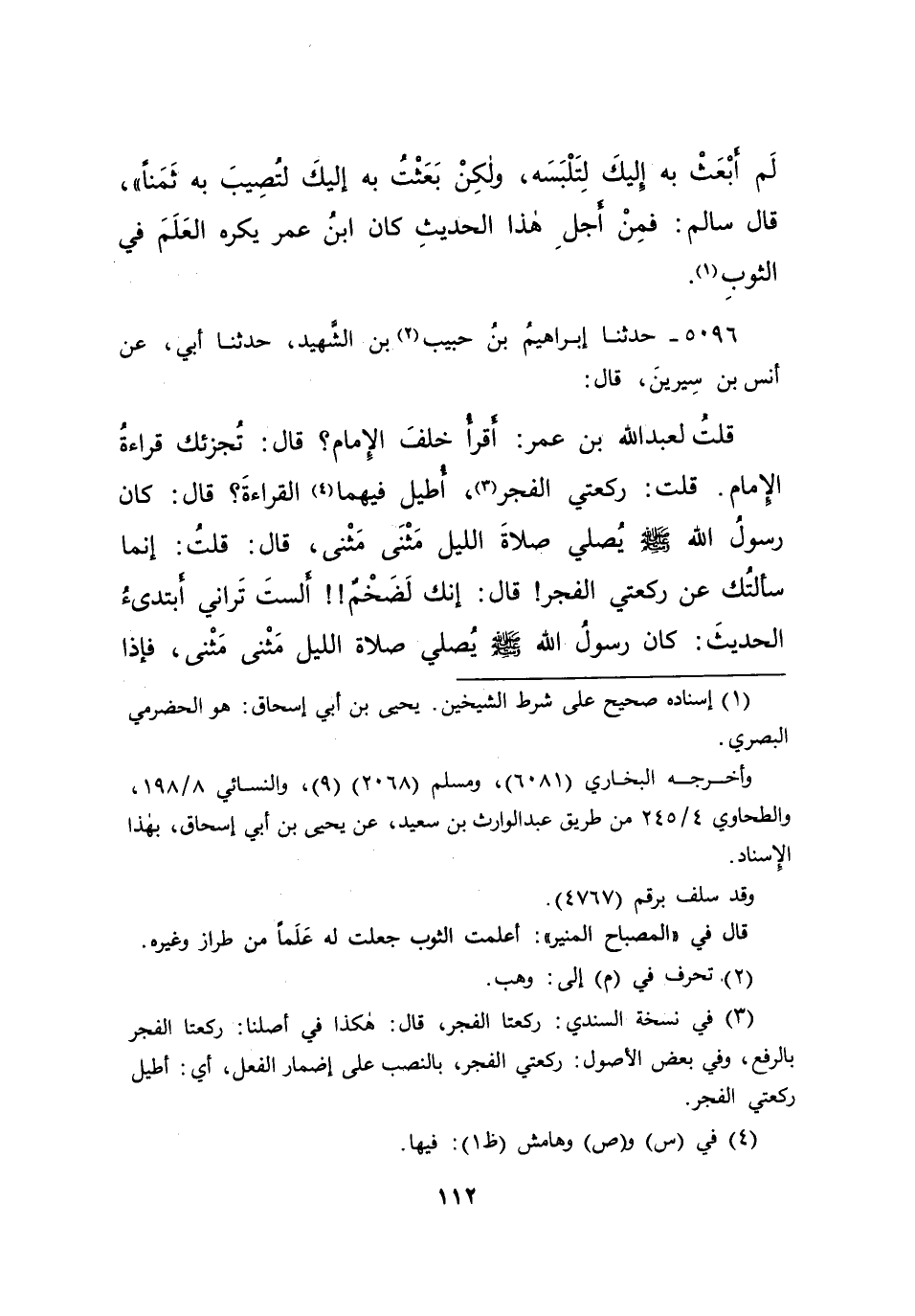 ٥٠٩٦ - حَدَّثَنَا إِبْرَاهِيمُ بْنُ حَبِيبِ (٢) بْنِ الشَّهِيدِ، حَدَّثَنَا أَبِي، عَنْ أَنَسِ بْنِ سِيرِينَ قَالَ: قُلْتُ: لِعَبْدِ اللهِ بْنِ عُمَرَ أَقْرَأُ خَلْفَ الْإِمَامِ؟ قَالَ: تُجْزِئُكَ قِرَاءَةُ الْإِمَامِ. قُلْتُ: رَكْعَتَيِ الْفَجْرِ، (٣) أُطِيلُ فِيهِمَا (٤) الْقِرَاءَةَ؟ قَالَ: " كَانَ رَسُولُ اللهِ صَلَّى اللهُ عَلَيْهِ وَسَلَّمَ يُصَلِّي صَلَاةَ اللَّيْلِ مَثْنَى مَثْنَى "، قَالَ: قُلْتُ: إِنَّمَا سَأَلْتُكَ عَنْ رَكْعَتَيِ الْفَجْرِ، قَالَ: إِنَّكَ لَضَخْمٌ أَلَسْتَ تَرَانِي أَبْتَدِئُ الْحَدِيثَ: " كَانَ رَسُولُ اللهِ صَلَّى اللهُ عَلَيْهِ وَسَلَّمَ يُصَلِّي صَلَاةَ اللَّيْلِ مَثْنَى مَثْنَى، فَإِذَا