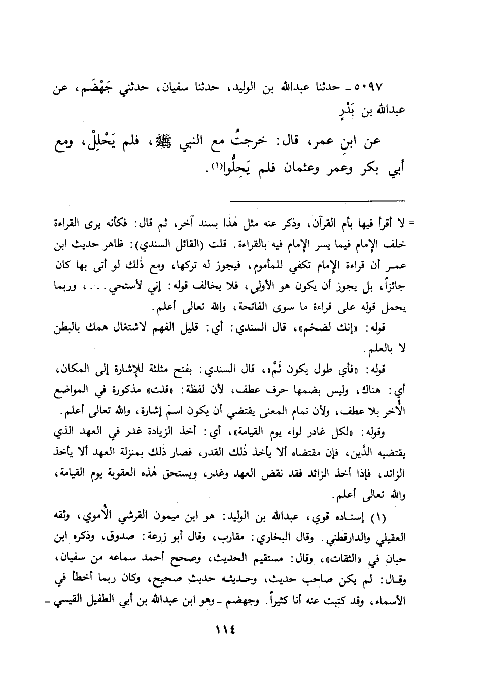 ٥٠٩٧ - حَدَّثَنَا عَبْدُ اللهِ بْنُ الْوَلِيدِ، حَدَّثَنَا سُفْيَانُ، حَدَّثَنِي جَهْضَمٌ، عَنْ عَبْدِ اللهِ بْنِ بَدْرٍ، عَنِ ابْنِ عُمَرَ قَالَ: " خَرَجْتُ مَعَ النَّبِيِّ صَلَّى اللهُ عَلَيْهِ وَسَلَّمَ فَلَمْ يَحْلِلْ " وَمَعَ أَبِي بَكْرٍ وَعُمَرَ وَعُثْمَانَ " فَلَمْ يَحِلُّوا " (١)
