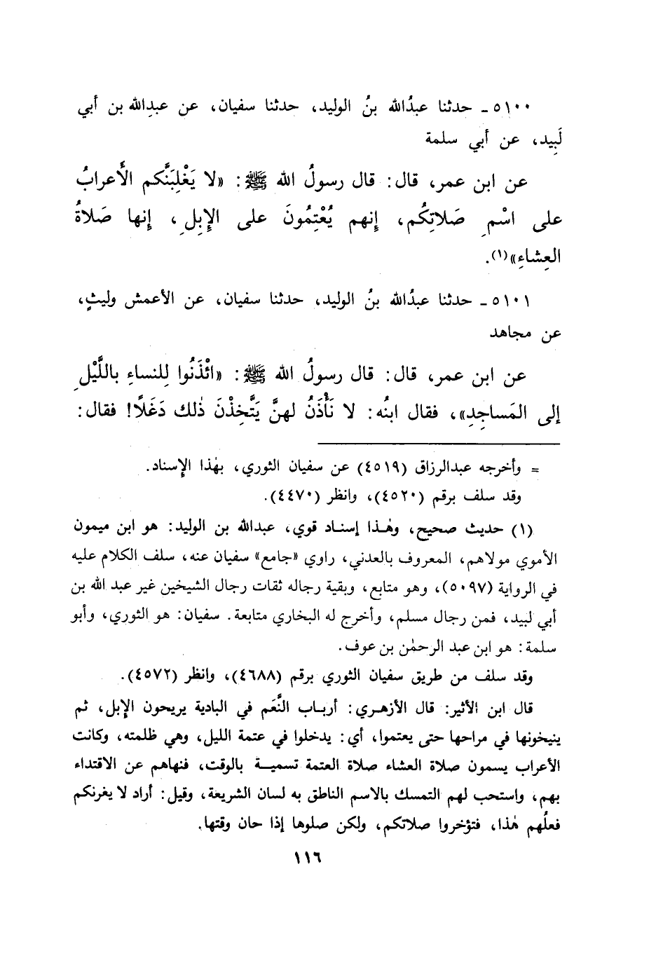 ٥١٠٠ - حَدَّثَنَا عَبْدُ اللهِ بْنُ الْوَلِيدِ، حَدَّثَنَا سُفْيَانُ، عَنْ عَبْدِ اللهِ بْنِ أَبِي لَبِيدٍ، عَنْ أَبِي سَلَمَةَ، عَنِ ابْنِ عُمَرَ قَالَ: قَالَ رَسُولُ اللهِ صَلَّى اللهُ عَلَيْهِ وَسَلَّمَ: " لَا يَغْلِبَنَّكُمُ الْأَعْرَابُ عَلَى اسْمِ صَلَاتِكُمْ، إِنَّهُمْ يُعْتِمُونَ عَلَى الْإِبِلِ إِنَّهَا صَلَاةُ الْعِشَاءِ " (١)