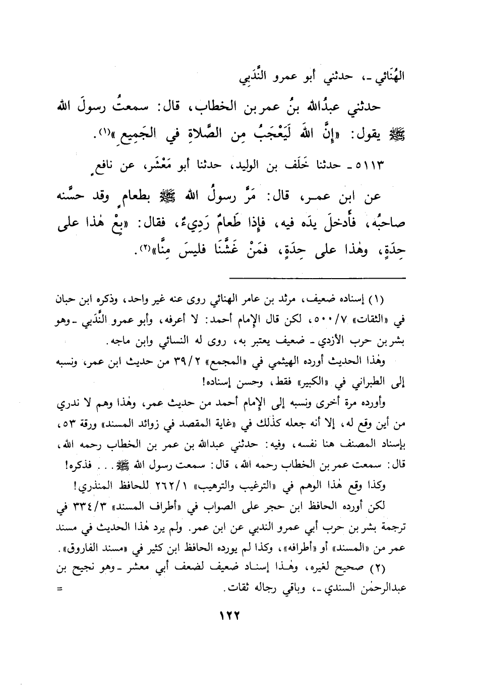 الْهُنَائِيَّ، حَدَّثَنِي أَبُو عَمْرٍو النَّدَبِيُّ، حَدَّثَنِي عَبْدُ اللهِ بْنُ عُمَرَ بْنِ الْخَطَّابِ قَالَ: سَمِعْتُ رَسُولَ اللهِ صَلَّى اللهُ عَلَيْهِ وَسَلَّمَ يَقُولُ: " إِنَّ اللهَ لَيَعْجَبُ مِنَ الصَّلَاةِ فِي الْجَمِيعِ " (١)
