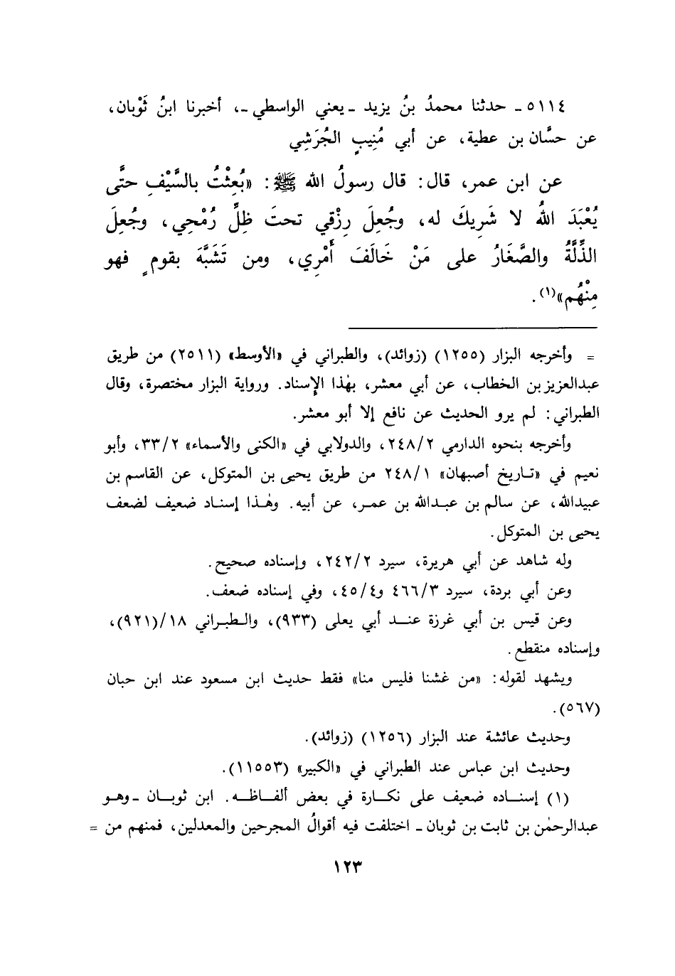 ٥١١٤ - حَدَّثَنَا مُحَمَّدُ بْنُ يَزِيدَ يَعْنِي الْوَاسِطِيَّ، أَخْبَرَنَا ابْنُ ثَوْبَانَ، عَنْ حَسَّانَ بْنِ عَطِيَّةَ، عَنْ أَبِي مُنِيبٍ الْجُرَشِيِّ، عَنِ ابْنِ عُمَرَ قَالَ: قَالَ رَسُولُ اللهِ صَلَّى اللهُ عَلَيْهِ وَسَلَّمَ: " بُعِثْتُ بِالسَّيْفِ حَتَّى يُعْبَدَ اللهُ لَا شَرِيكَ لَهُ، وَجُعِلَ رِزْقِي تَحْتَ ظِلِّ رُمْحِي، وَجُعِلَ الذِّلَّةُ، وَالصَّغَارُ عَلَى مَنْ خَالَفَ أَمْرِي، وَمَنْ تَشَبَّهَ بِقَوْمٍ فَهُوَ مِنْهُمْ " (١)
