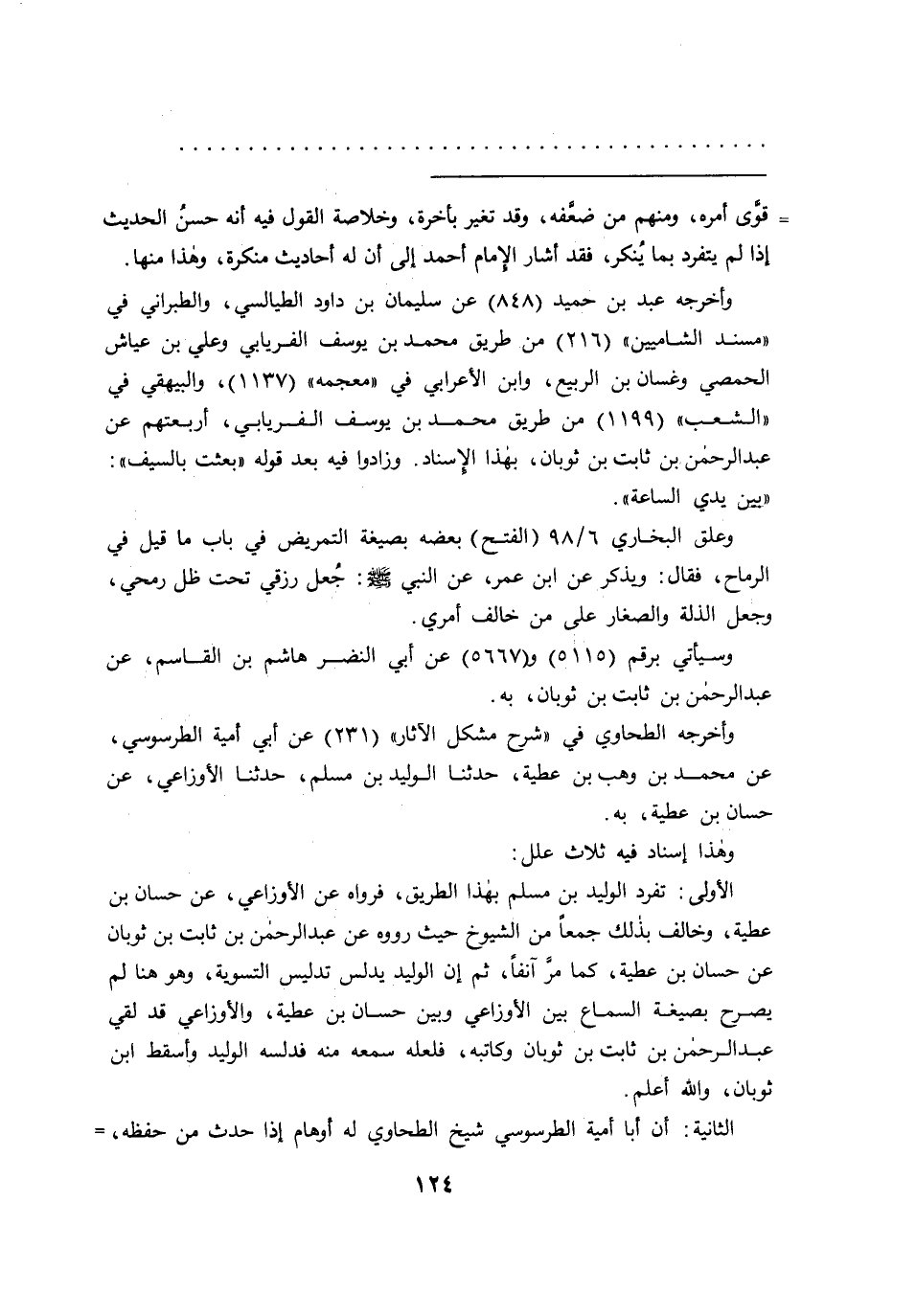 الأولى: تفرد الوليد بن مسلم بهذا الطريق، فرواه عن الأوزاعي، عن حسان بن عطية، وخالف بذلك جمعاً من الشيوخ حيث رووه عن عبد الرحمن بن ثابت بن ثوبان عن حسان بن عطية، كما مر آنفاً، ثم إن الوليد يدلس تدليس التسوية، وهو هنا لم يصرح بصيغة السماع بين الأوزاعي وبين حسان بن عطية، والأوزاعي قد لقي عبد الرحمن بن ثابت بن ثوبان وكاتبه، فلعله سمعه منه فدلسه الوليد وأسقط ابن ثوبان، والله أعلم.