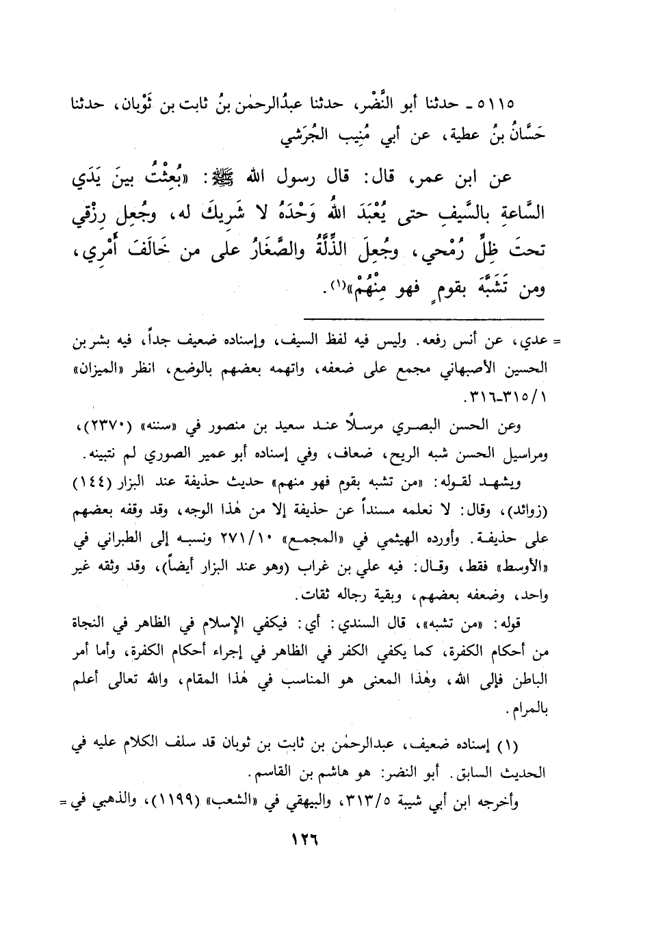 ٥١١٥ - حَدَّثَنَا أَبُو النَّضْرِ، حَدَّثَنَا عَبْدُ الرَّحْمَنِ بْنُ ثَابِتِ بْنِ ثَوْبَانَ، حَدَّثَنَا حَسَّانُ بْنُ عَطِيَّةَ، عَنْ أَبِي مُنِيبٍ الْجُرَشِيِّ، عَنِ ابْنِ عُمَرَ قَالَ: قَالَ رَسُولُ اللهِ صَلَّى اللهُ عَلَيْهِ وَسَلَّمَ: " بُعِثْتُ بَيْنَ يَدَيِ السَّاعَةِ بِالسَّيْفِ حَتَّى يُعْبَدَ اللهُ وَحْدَهُ لَا شَرِيكَ لَهُ، وَجُعِلَ رِزْقِي تَحْتَ ظِلِّ رُمْحِي، وَجُعِلَ الذِّلَّةُ وَالصَّغَارُ عَلَى مَنْ خَالَفَ أَمْرِي، وَمَنْ تَشَبَّهَ بِقَوْمٍ فَهُوَ مِنْهُمْ " (١)