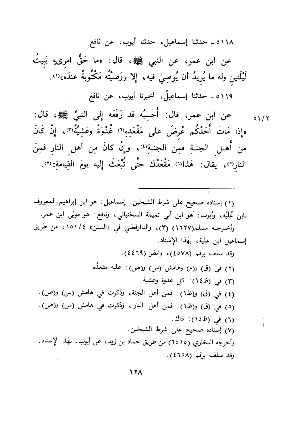 ٥١١٨ - حَدَّثَنَا إِسْمَاعِيلُ، حَدَّثَنَا أَيُّوبُ، عَنْ نَافِعٍ، عَنِ ابْنِ عُمَرَ، عَنِ النَّبِيِّ صَلَّى اللهُ عَلَيْهِ وَسَلَّمَ قَالَ: " مَا حَقُّ امْرِئٍ يَبِيتُ لَيْلَتَيْنِ وَلَهُ مَا يُرِيدُ أَنْ يُوصِيَ فِيهِ، إِلَّا وَوَصِيَّتُهُ مَكْتُوبَةٌ عِنْدَهُ " (١)