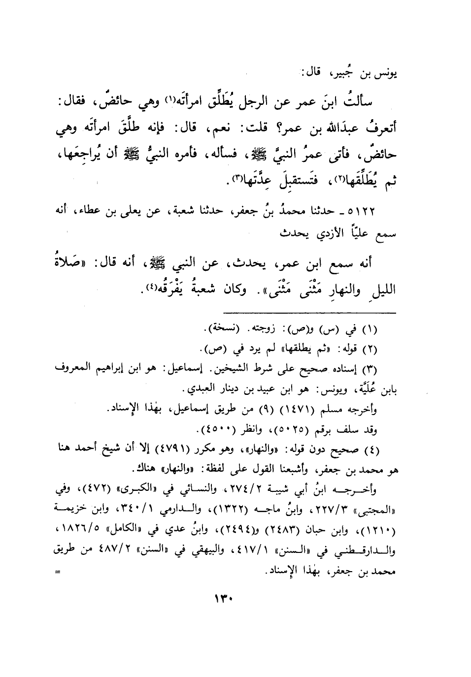 يُونُسَ بْنِ جُبَيْرٍ قَالَ: سَأَلْتُ ابْنَ عُمَرَ: عَنِ الرَّجُلِ يُطَلِّقُ امْرَأَتَهُ (١) وَهِيَ حَائِضٌ، فَقَالَ: أَتَعْرِفُ عَبْدَ اللهِ بْنَ عُمَرَ؟ قُلْتُ: نَعَمْ. قَالَ: فَإِنَّهُ طَلَّقَ امْرَأَتَهُ وَهِيَ حَائِضٌ، فَأَتَى عُمَرُ النَّبِيَّ صَلَّى اللهُ عَلَيْهِ وَسَلَّمَ فَسَأَلَهُ، " فَأَمَرَهُ النَّبِيُّ صَلَّى اللهُ عَلَيْهِ وَسَلَّمَ أَنْ يُرَاجِعَهَا ثُمَّ يُطَلِّقَهَا (٢) فَتَسْتَقْبِلَ عِدَّتَهَا " (٣)