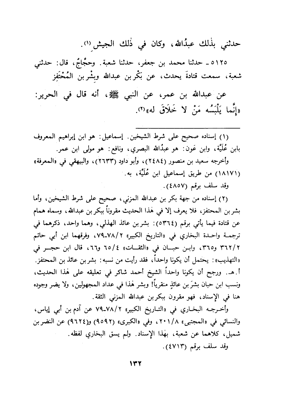 ٥١٢٥ - حَدَّثَنَا مُحَمَّدُ بْنُ جَعْفَرٍ، حَدَّثَنَا شُعْبَةُ، وَحَجَّاجٌ، قَالَ: حَدَّثَنِي شُعْبَةُ، سَمِعْتُ قَتَادَةَ، يُحَدِّثُ عَنْ بَكْرِ بْنِ عَبْدِ اللهِ، وَبِشْرِ بْنِ الْمُحْتَفِزِ، عَنْ عَبْدِ اللهِ بْنِ عُمَرَ، عَنِ النَّبِيِّ صَلَّى اللهُ عَلَيْهِ وَسَلَّمَ أَنَّهُ قَالَ فِي الْحَرِيرِ: " إِنَّمَا يَلْبَسُهُ مَنْ لَا خَلَاقَ لَهُ " (٢)