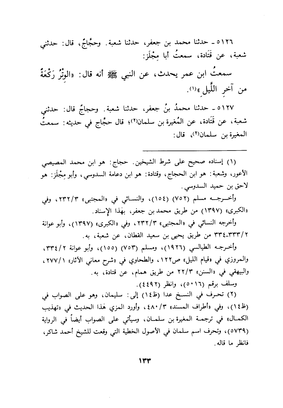 ٥١٢٦ - حَدَّثَنَا مُحَمَّدُ بْنُ جَعْفَرٍ، حَدَّثَنَا شُعْبَةُ، وَحَجَّاجٌ قَالَ: حَدَّثَنِي شُعْبَةُ، عَنْ قَتَادَةَ، وَسَمِعْتُ أَبَا مِجْلَزٍ، سَمِعْتُ ابْنَ عُمَرَ يُحَدِّثُ، عَنِ النَّبِيِّ صَلَّى اللهُ عَلَيْهِ وَسَلَّمَ أَنَّهُ قَالَ: " الْوَتْرُ رَكْعَةٌ مِنْ آخِرِ اللَّيْلِ " (١)