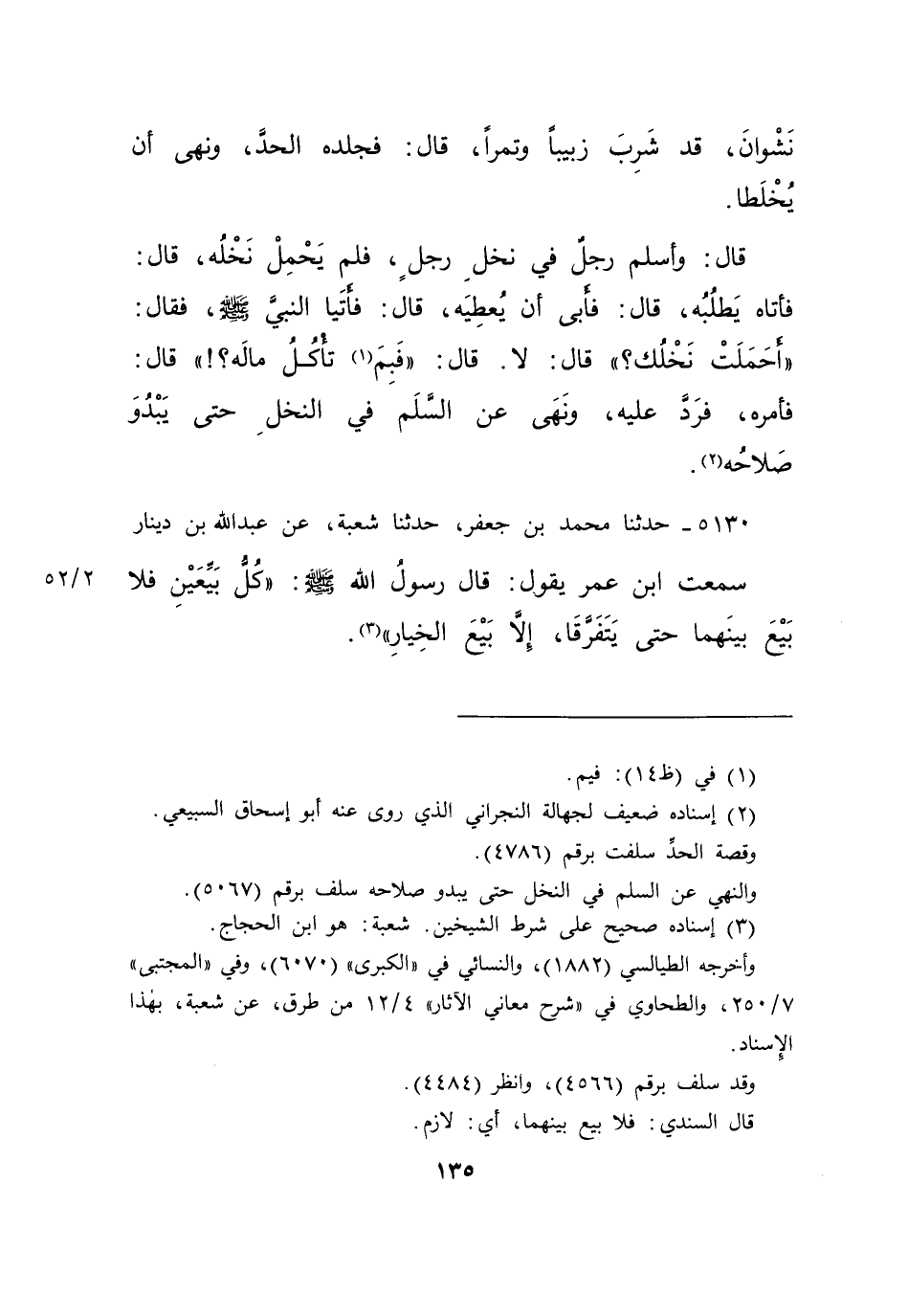 نَشْوَانَ قَدْ شَرِبَ زَبِيبًا وَتَمْرًا قَالَ: فَجَلَدَهُ الْحَدَّ، وَنَهَى أَنْ يُخْلَطَا. قَالَ: وَأَسْلَمَ رَجُلٌ فِي نَخْلِ رَجُلٍ فَلَمْ يَحْمِلْ نَخْلُهُ قَالَ: فَأَتَاهُ يَطْلُبُهُ قَالَ: فَأَبَى أَنْ يُعْطِيَهُ، قَالَ: فَأَتَيَا النَّبِيَّ صَلَّى اللهُ عَلَيْهِ وَسَلَّمَ فَقَالَ: " أَحَمَلَتْ نَخْلُكَ؟ " قَالَ: لَا. قَالَ: " فَبِمَ (١) تَأْكُلُ مَالَهُ؟ " قَالَ: فَأَمَرَهُ، فَرَدَّ عَلَيْهِ، وَنَهَى عَنِ السَّلَمِ فِي النَّخْلِ حَتَّى يَبْدُوَ صَلَاحُهُ (٢)