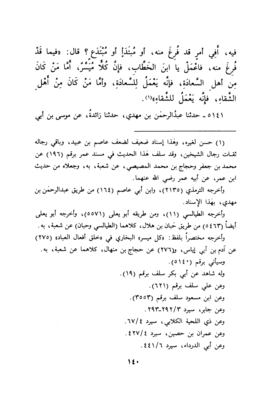 فِيهِ أَفِي أَمْرٍ قَدْ فُرِغَ مِنْهُ أَوْ مُبْتَدَإٍ أَوْ مُبْتَدَعٍ؟ قَالَ: " فِيمَا قَدْ فُرِغَ مِنْهُ فَاعْمَلْ يَا ابْنَ الْخَطَّابِ فَإِنَّ كُلًّا مُيَسَّرٌ، أَمَّا مَنْ كَانَ مِنْ أَهْلِ السَّعَادَةِ فَإِنَّهُ يَعْمَلُ لِلسَّعَادَةِ، وَأَمَّا مَنْ كَانَ مِنْ أَهْلِ الشَّقَاءِ فَإِنَّهُ يَعْمَلُ لِلشَّقَاءِ " (١)