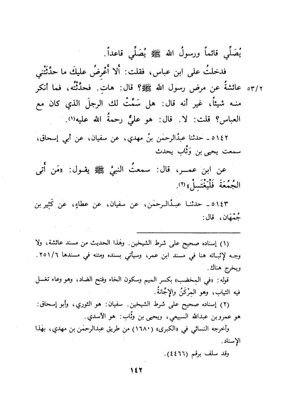 ٥١٤٢ - حَدَّثَنَا عَبْدُ الرَّحْمَنِ بْنُ مَهْدِيٍّ، عَنْ سُفْيَانَ، عَنْ أَبِي إِسْحَاقَ، سَمِعْتُ يَحْيَى بْنَ وَثَّابٍ، يُحَدِّثُ عَنِ ابْنِ عُمَرَ قَالَ: سَمِعْتُ النَّبِيَّ صَلَّى اللهُ عَلَيْهِ وَسَلَّمَ يَقُولُ: " مَنْ أَتَى الْجُمُعَةَ فَلْيَغْتَسِلْ " (٢)