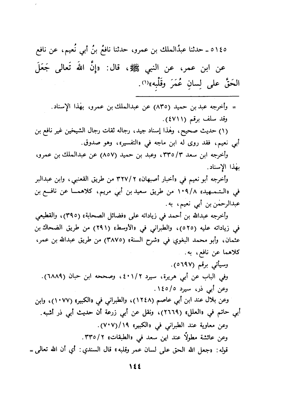 ٥١٤٥ - حَدَّثَنَا عَبْدُ الْمَلِكِ بْنُ عَمْرٍو، حَدَّثَنَا نَافِعُ بْنُ أَبِي نُعَيْمٍ، عَنْ نَافِعٍ، عَنِ ابْنِ عُمَرَ، عَنِ النَّبِيِّ صَلَّى اللهُ عَلَيْهِ وَسَلَّمَ قَالَ: " إِنَّ اللهَ تَعَالَى جَعَلَ الْحَقَّ عَلَى لِسَانِ عُمَرَ وَقَلْبِهِ " (١)