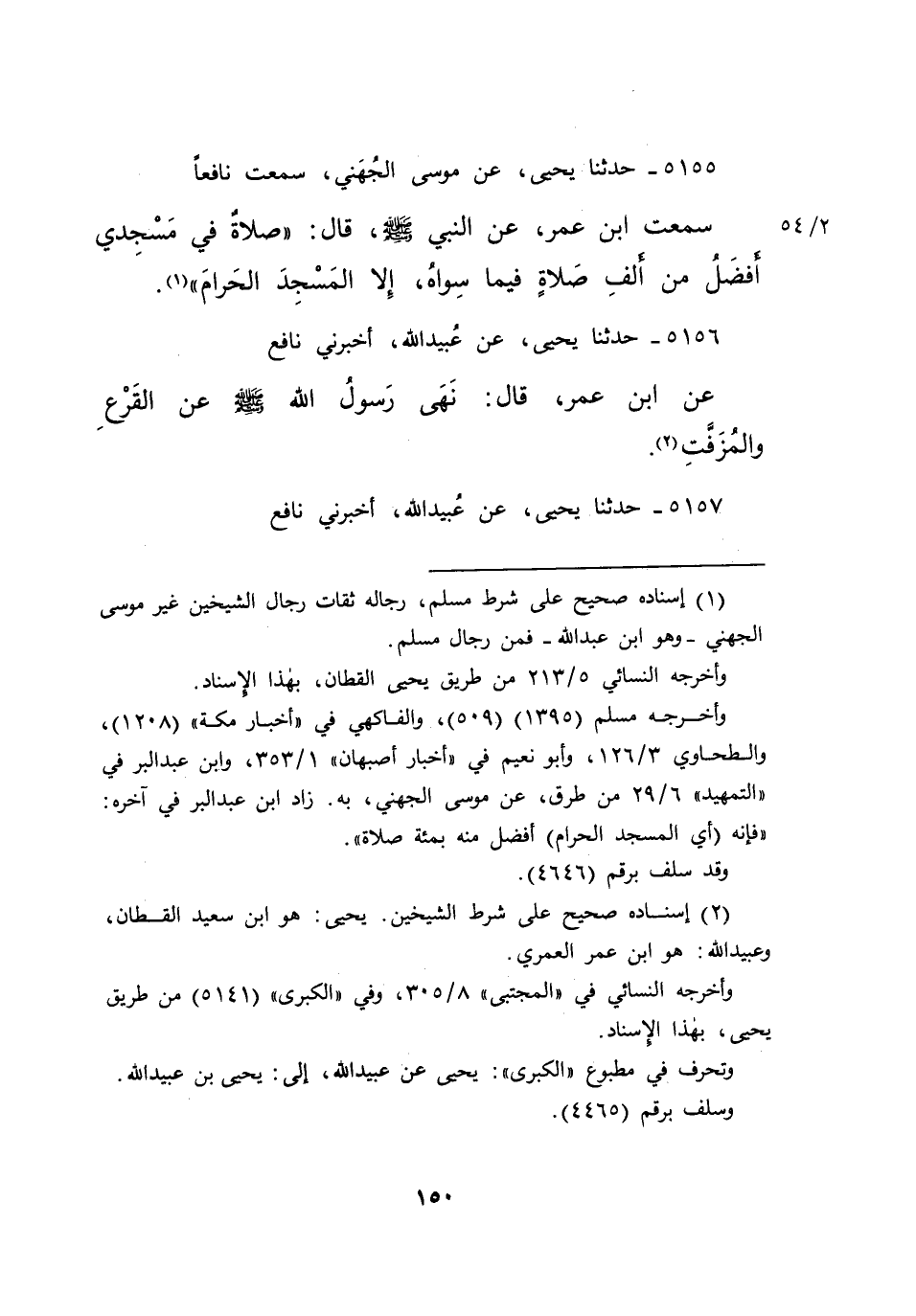 ٥١٥٥ - حَدَّثَنَا يَحْيَى، عَنْ مُوسَى الْجُهَنِيِّ، سَمِعْتُ نَافِعًا، سَمِعْتُ ابْنَ عُمَرَ، عَنِ النَّبِيِّ صَلَّى اللهُ عَلَيْهِ وَسَلَّمَ قَالَ: " صَلَاةٌ فِي مَسْجِدِي أَفْضَلُ مِنْ أَلْفِ صَلَاةٍ فِيمَا سِوَاهُ، إِلَّا الْمَسْجِدَ الْحَرَامَ " (١)
