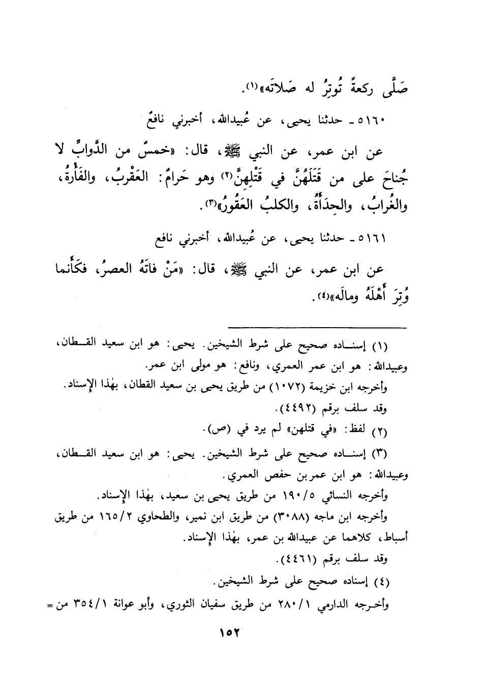٥١٦٠ - حَدَّثَنَا يَحْيَى، عَنْ عُبَيْدِ اللهِ، أَخْبَرَنِي نَافِعٌ، عَنِ ابْنِ عُمَرَ، عَنِ النَّبِيِّ صَلَّى اللهُ عَلَيْهِ وَسَلَّمَ قَالَ: " خَمْسٌ مِنَ الدَّوَابِّ لَا جُنَاحَ عَلَى مَنْ قَتَلَهُنَّ فِي قَتْلِهِنَّ (٢) وَهُوَ حَرَامٌ: الْعَقْرَبُ، وَالْفَأْرَةُ، وَالْغُرَابُ، وَالْحِدَأَةُ، وَالْكَلْبُ الْعَقُورُ " (٣)