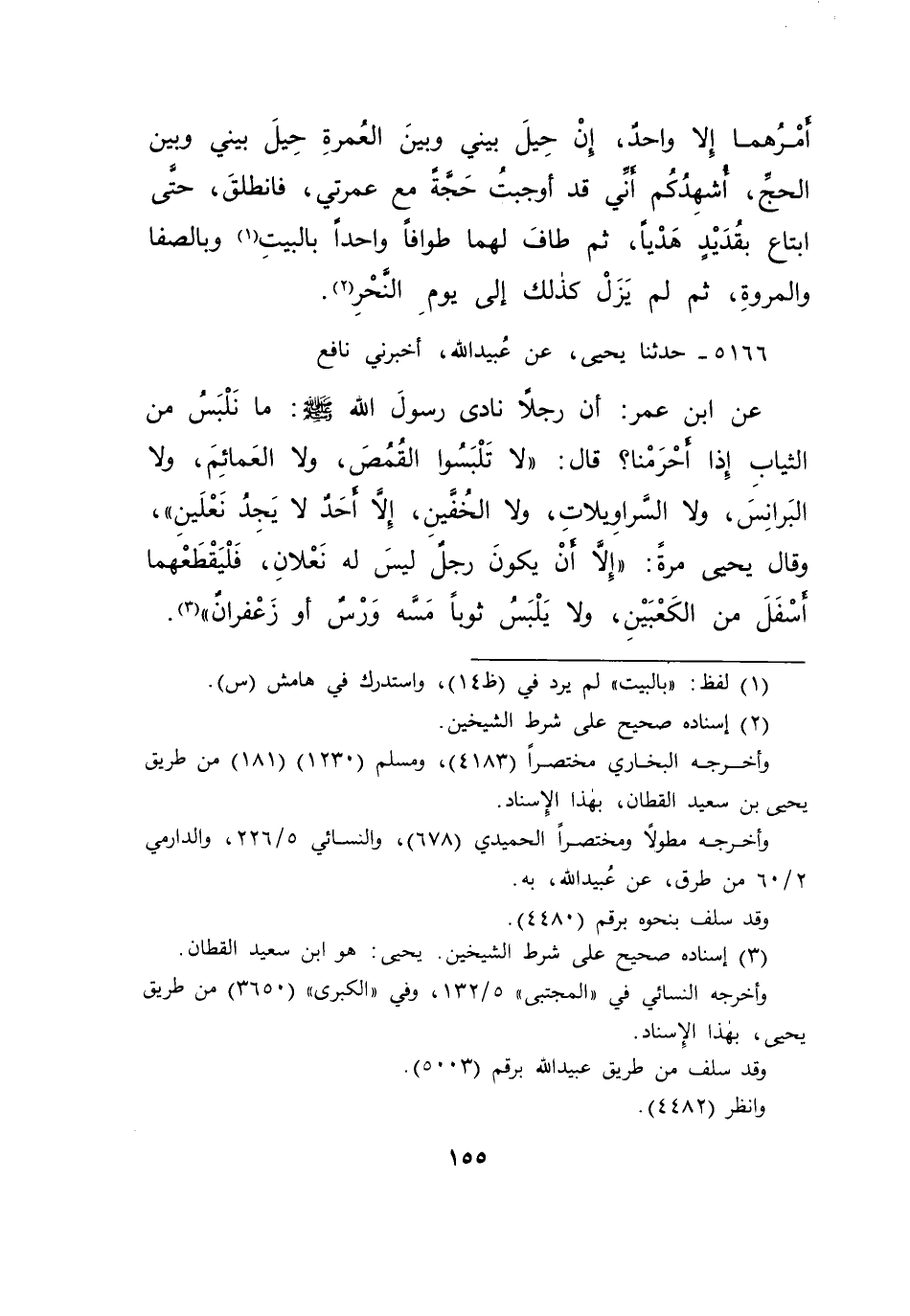 ٥١٦٦ - حَدَّثَنَا يَحْيَى، عَنْ عُبَيْدِ اللهِ، أَخْبَرَنِي نَافِعٌ، عَنِ ابْنِ عُمَرَ، أَنَّ رَجُلًا نَادَى رَسُولَ اللهِ صَلَّى اللهُ عَلَيْهِ وَسَلَّمَ: مَا نَلْبَسُ مِنَ الثِّيَابِ إِذَا أَحْرَمْنَا قَالَ: " لَا تَلْبَسُوا الْقُمُصَ، وَلَا الْعَمَائِمَ، وَلَا الْبَرَانِسَ، وَلَا السَّرَاوِيلَاتِ، وَلَا الْخُفَّيْنِ إِلَّا أَحَدٌ لَا يَجِدُ نَعْلَيْنِ " وَقَالَ يَحْيَى مَرَّةً: " إِلَّا أَنْ يَكُونَ رَجُلٌ لَيْسَ لَهُ نَعْلَانِ فَلْيَقْطَعْهُمَا أَسْفَلَ مِنَ الْكَعْبَيْنِ، وَلَا يَلْبَسْ ثَوْبًا مَسَّهُ وَرْسٌ أَوْ زَعْفَرَانٌ " (٣)