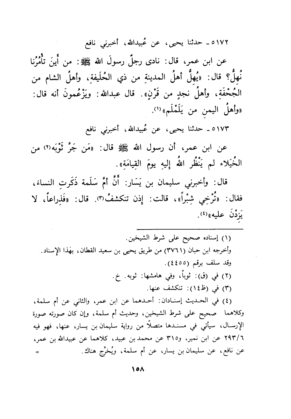 ٥١٧٣ - حَدَّثَنَا يَحْيَى، عَنْ عُبَيْدِ اللهِ، أَخْبَرَنِي نَافِعٌ، عَنِ ابْنِ عُمَرَ، أَنَّ رَسُولَ اللهِ صَلَّى اللهُ عَلَيْهِ وَسَلَّمَ قَالَ: " مَنْ جَرَّ ثَوْبَهُ (٢) مِنَ الْخُيَلَاءِ لَمْ يَنْظُرِ اللهُ إِلَيْهِ يَوْمَ الْقِيَامَةِ " قَالَ: وَأَخْبَرَنِي سُلَيْمَانُ بْنُ يَسَارٍ، أَنَّ أُمَّ سَلَمَةَ ذَكَرَتِ النِّسَاءَ فَقَالَ: " تُرْخِي شِبْرًا "، قَالَتْ: إِذَنْ تَنْكَشِفَ، (٣) قَالَ " فَذِرَاعًا لَا يَزِدْنَ عَلَيْهِ " (٤)