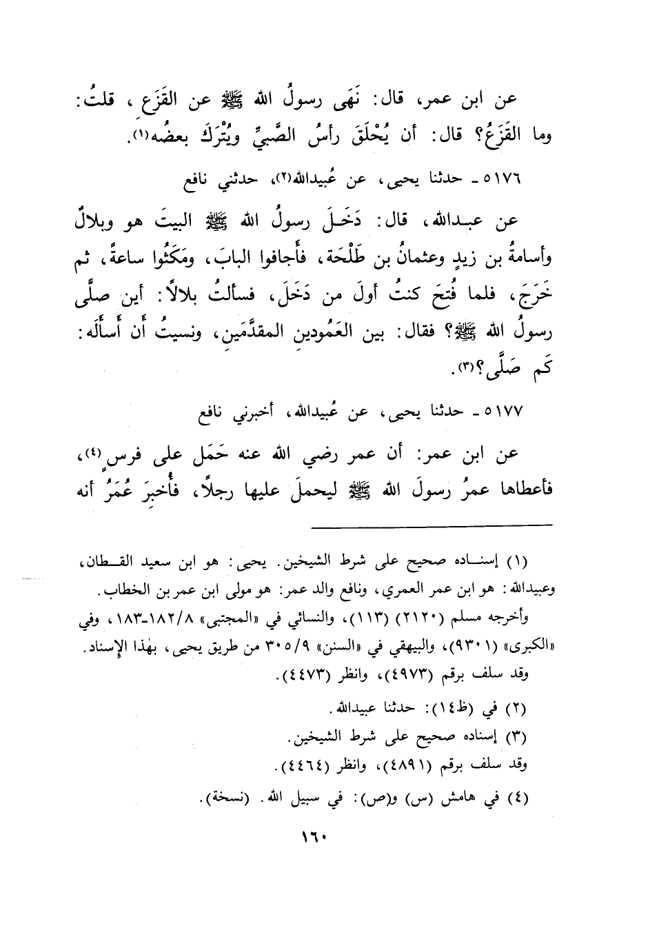 ٥١٧٦ - حَدَّثَنَا يَحْيَى، عَنْ عُبَيْدِ اللهِ، (٢) حَدَّثَنِي نَافِعٌ، عَنْ عَبْدِ اللهِ قَالَ: دَخَلَ رَسُولُ اللهِ صَلَّى اللهُ عَلَيْهِ وَسَلَّمَ الْبَيْتَ هُو وَبِلَالٌ وَأُسَامَةُ بْنُ زَيْدٍ وَعُثْمَانُ بْنُ طَلْحَةَ، فَأَجَافُوا الْبَابَ، وَمَكَثُوا سَاعَةً، ثُمَّ خَرَجَ، فَلَمَّا فُتِحَ كُنْتُ أَوَّلَ مَنْ دَخَلَ، فَسَأَلْتُ بِلَالًا: أَيْنَ صَلَّى رَسُولُ اللهِ صَلَّى اللهُ عَلَيْهِ وَسَلَّمَ؟ فَقَالَ: " بَيْنَ الْعَمُودَيْنِ الْمُقَدَّمَيْنِ "، وَنَسِيتُ أَنْ أَسْأَلَهُ كَمْ صَلَّى (٣)