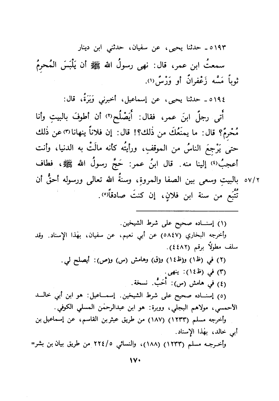 ٥١٩٤ - حَدَّثَنَا يَحْيَى، عَنْ إِسْمَاعِيلَ، أَخْبَرَنِي وَبَرَةُ، قَالَ: أَتَى رَجُلٌ ابْنَ عُمَرَ فَقَالَ: أَيَصْلُحُ (٢) أَنْ أَطُوفَ بِالْبَيْتِ وَأَنَا مُحْرِمٌ؟ قَالَ: مَا يَمْنَعُكَ مِنْ ذَلِكَ؟ قَالَ: إِنَّ فُلَانًا يَنْهَانَا (٣) عَنْ ذَلِكَ، حَتَّى يَرْجِعَ النَّاسُ مِنَ الْمَوْقِفِ، وَرَأَيْتُهُ كَأَنَّهُ مَالَتْ بِهِ الدُّنْيَا، وَأَنْتَ أَعْجَبُ (٤) إِلَيْنَا مِنْهُ، قَالَ ابْنُ عُمَرَ: " حَجَّ رَسُولُ اللهِ صَلَّى اللهُ عَلَيْهِ وَسَلَّمَ فَطَافَ بِالْبَيْتِ، وَسَعَى بَيْنَ الصَّفَا وَالْمَرْوَةِ " وَسُنَّةُ اللهِ تَعَالَى وَرَسُولِهِ أَحَقُّ أَنْ تُتَّبَعَ مِنْ سُنَّةِ ابْنِ فُلَانٍ إِنْ كُنْتَ صَادِقًا (٥)