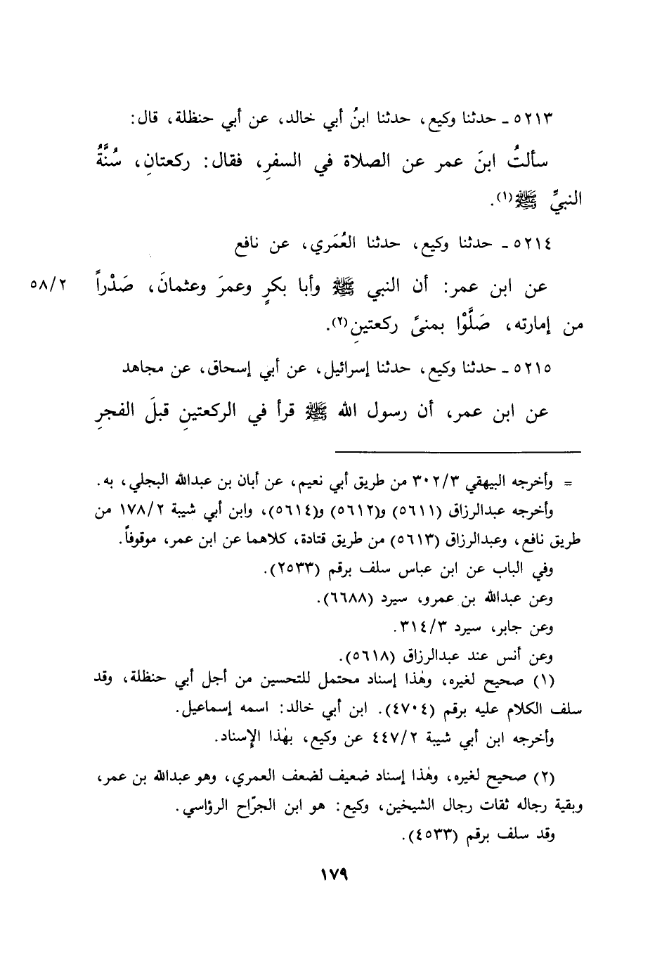 ٥٢١٣ - حَدَّثَنَا وَكِيعٌ، حَدَّثَنَا ابْنُ أَبِي خَالِدٍ، عَنْ أَبِي حَنْظَلَةَ قَالَ: سَأَلْتُ ابْنَ عُمَرَ عَنِ الصَّلَاةِ فِي السَّفَرِ، فَقَالَ: " رَكْعَتَانِ سُنَّةُ النَّبِيِّ صَلَّى اللهُ عَلَيْهِ وَسَلَّمَ " (١)