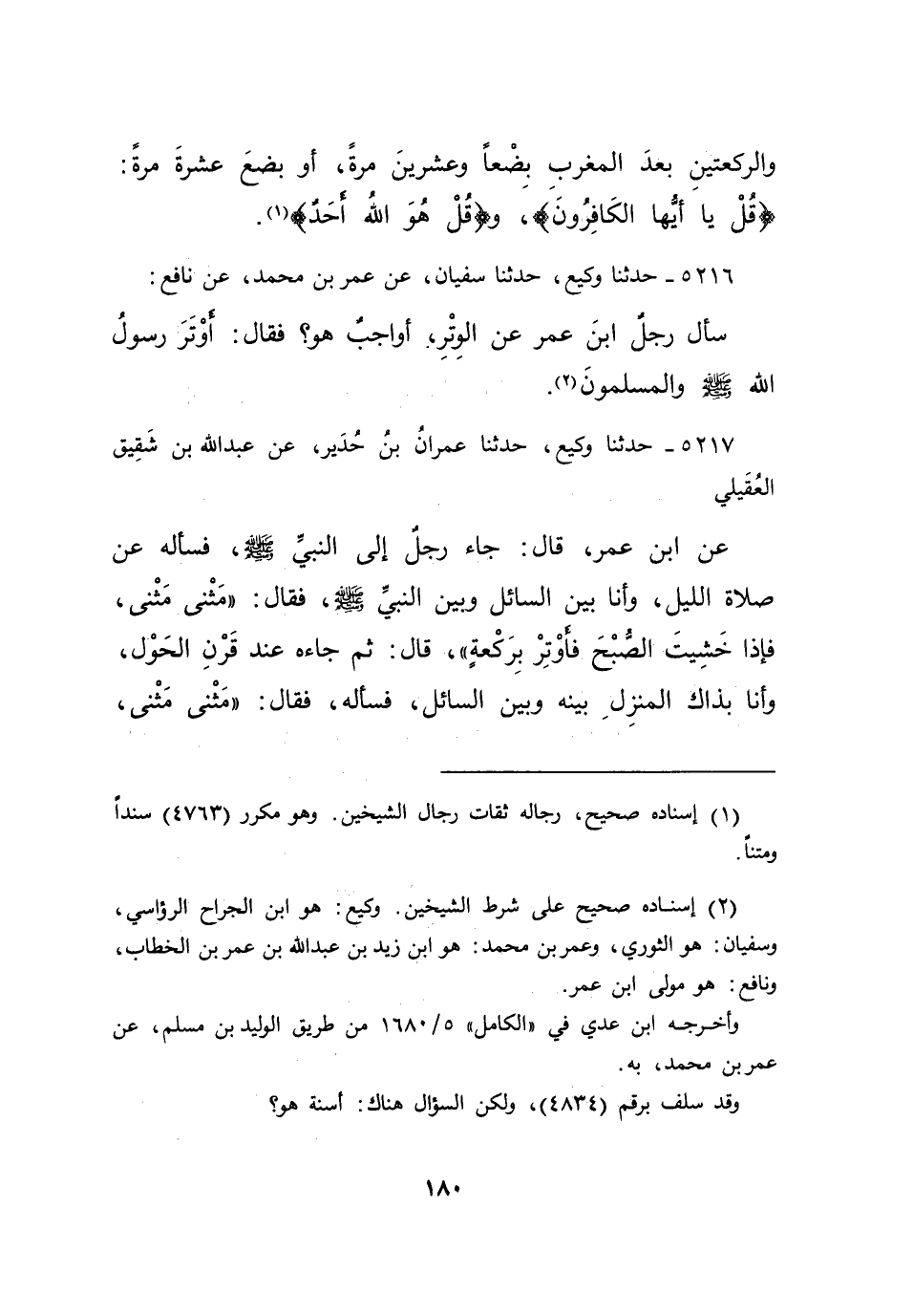 ٥٢١٦ - حَدَّثَنَا وَكِيعٌ، حَدَّثَنَا سُفْيَانُ، عَنْ عُمَرَ بْنِ مُحَمَّدٍ، عَنْ نَافِعٍ، سَأَلَ رَجُلٌ ابْنَ عُمَرَ، عَنِ الْوَتْرِ أَوَاجِبٌ هُوَ؟ فَقَالَ: " أَوْتَرَ رَسُولُ اللهِ صَلَّى اللهُ عَلَيْهِ وَسَلَّمَ وَالْمُسْلِمُونَ " (٢)