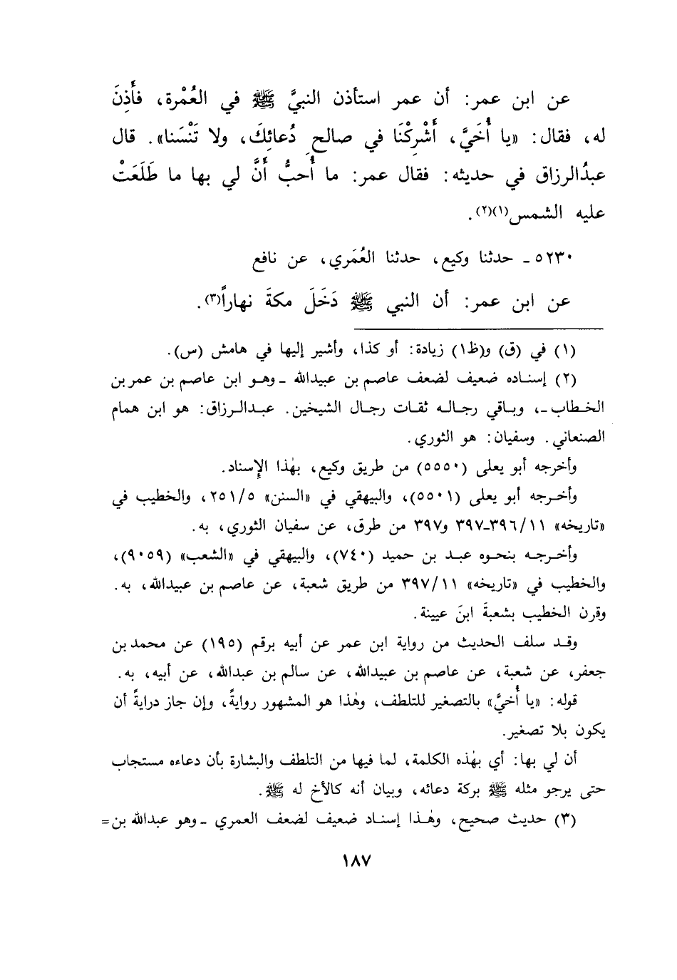 ٥٢٣٠ - حَدَّثَنَا وَكِيعٌ، حَدَّثَنَا الْعُمَرِيُّ، عَنْ نَافِعٍ، عَنِ ابْنِ عُمَرَ، " أَنَّ النَّبِيَّ صَلَّى اللهُ عَلَيْهِ وَسَلَّمَ دَخَلَ مَكَّةَ نَهَارًا " (٣)