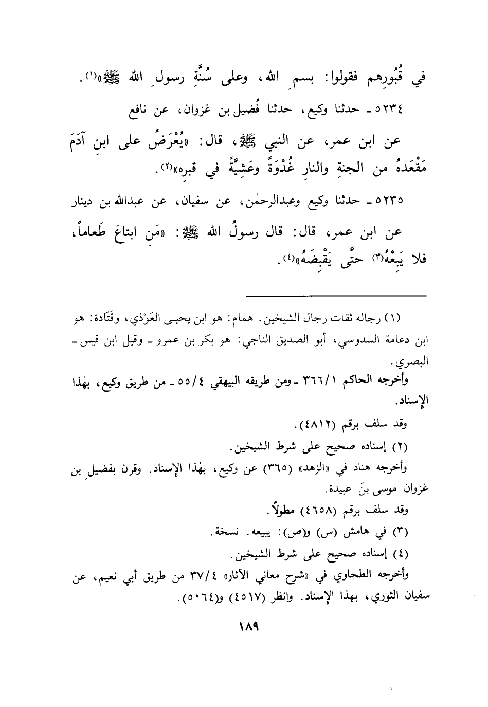 ٥٢٣٤ - حَدَّثَنَا وَكِيعٌ، حَدَّثَنَا فُضَيْلُ بْنُ غَزْوَانَ، عَنْ نَافِعٍ، عَنِ ابْنِ عُمَرَ، عَنِ النَّبِيِّ صَلَّى اللهُ عَلَيْهِ وَسَلَّمَ قَالَ: " يُعْرَضُ عَلَى ابْنِ آدَمَ مَقْعَدُهُ مِنَ الْجَنَّةِ وَالنَّارِ غُدْوَةً وَعَشِيَّةً فِي قَبْرِهِ " (٢)