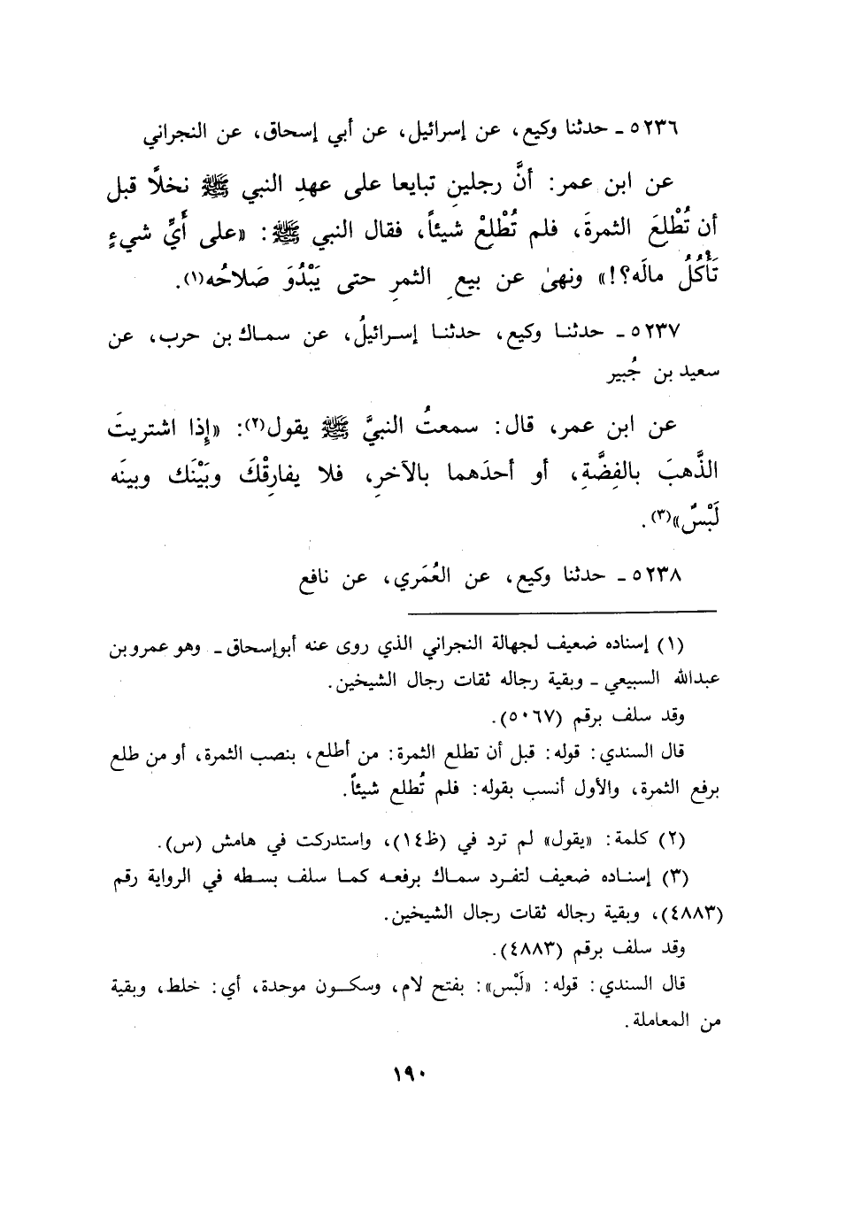 ٥٢٣٦ - حَدَّثَنَا وَكِيعٌ، عَنْ إِسْرَائِيلَ، عَنْ أَبِي إِسْحَاقَ، عَنِ النَّجْرَانِيِّ، عَنِ ابْنِ عُمَرَ، أَنَّ رَجُلَيْنِ تَبَايَعَا عَلَى عَهْدِ النَّبِيِّ صَلَّى اللهُ عَلَيْهِ وَسَلَّمَ نَخْلًا قَبْلَ أَنْ تَطْلُعَ الثَّمَرَةُ، فَلَمْ تُطْلِعْ شَيْئًا، فَقَالَ النَّبِيُّ صَلَّى اللهُ عَلَيْهِ وَسَلَّمَ: " عَلَى أَيِّ شَيْءٍ تَأْكُلُ مَالَهُ "، وَنَهَى عَنْ بَيْعِ الثَّمَرِ حَتَّى يَبْدُوَ صَلَاحُهُ " (١)