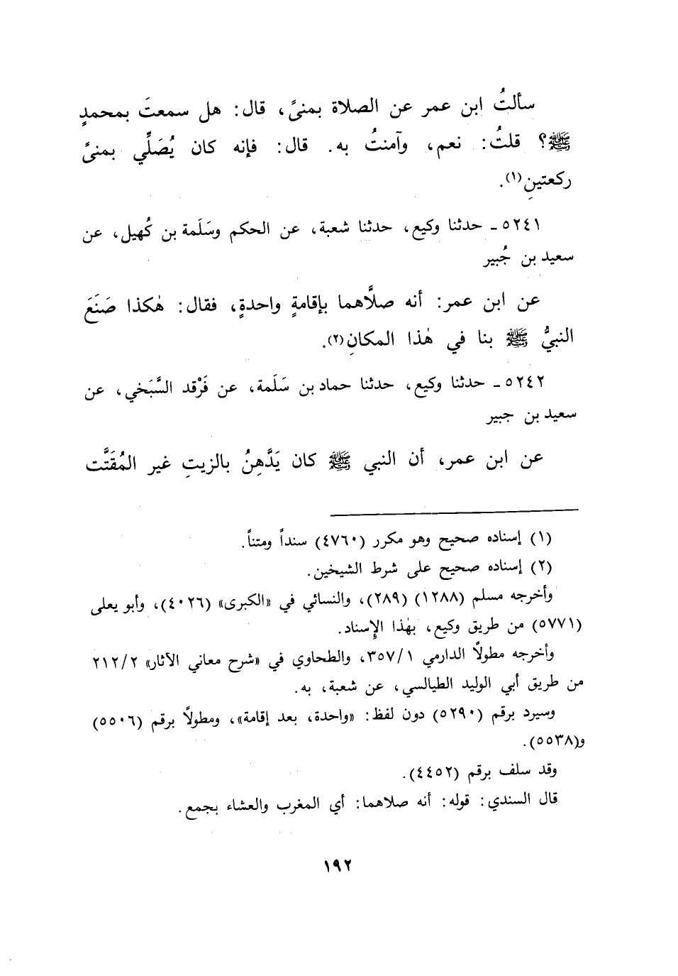 ٥٢٤٢ - حَدَّثَنَا وَكِيعٌ، حَدَّثَنَا حَمَّادُ بْنُ سَلَمَةَ، عَنْ فَرْقَدٍ السَّبَخِيِّ، عَنْ سَعِيدِ بْنِ جُبَيْرٍ، عَنِ ابْنِ عُمَرَ، " أَنَّ النَّبِيَّ صَلَّى اللهُ عَلَيْهِ وَسَلَّمَ كَانَ يَدَّهِنُ بِالزَّيْتِ غَيْرِ الْمُقَتَّتِ