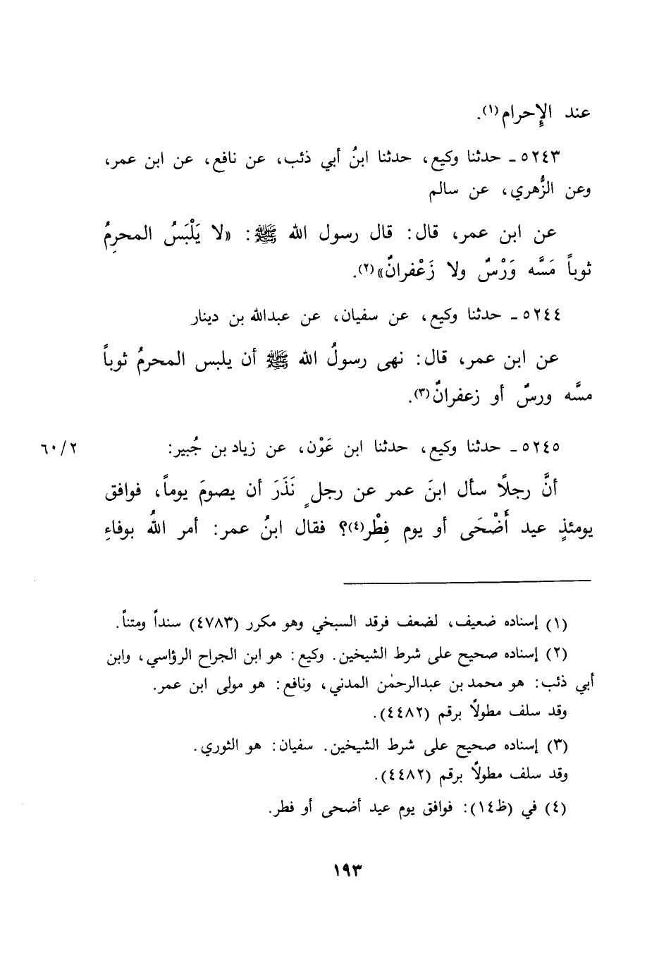 ٥٢٤٤ - حَدَّثَنَا وَكِيعٌ، عَنْ سُفْيَانَ، عَنْ عَبْدِ اللهِ بْنِ دِينَارٍ، عَنِ ابْنِ عُمَرَ قَالَ: " نَهَى رَسُولُ اللهِ صَلَّى اللهُ عَلَيْهِ وَسَلَّمَ أَنْ يَلْبَسَ الْمُحْرِمُ ثَوْبًا مَسَّهُ وَرْسٌ أَوْ زَعْفَرَانٌ " (٣)