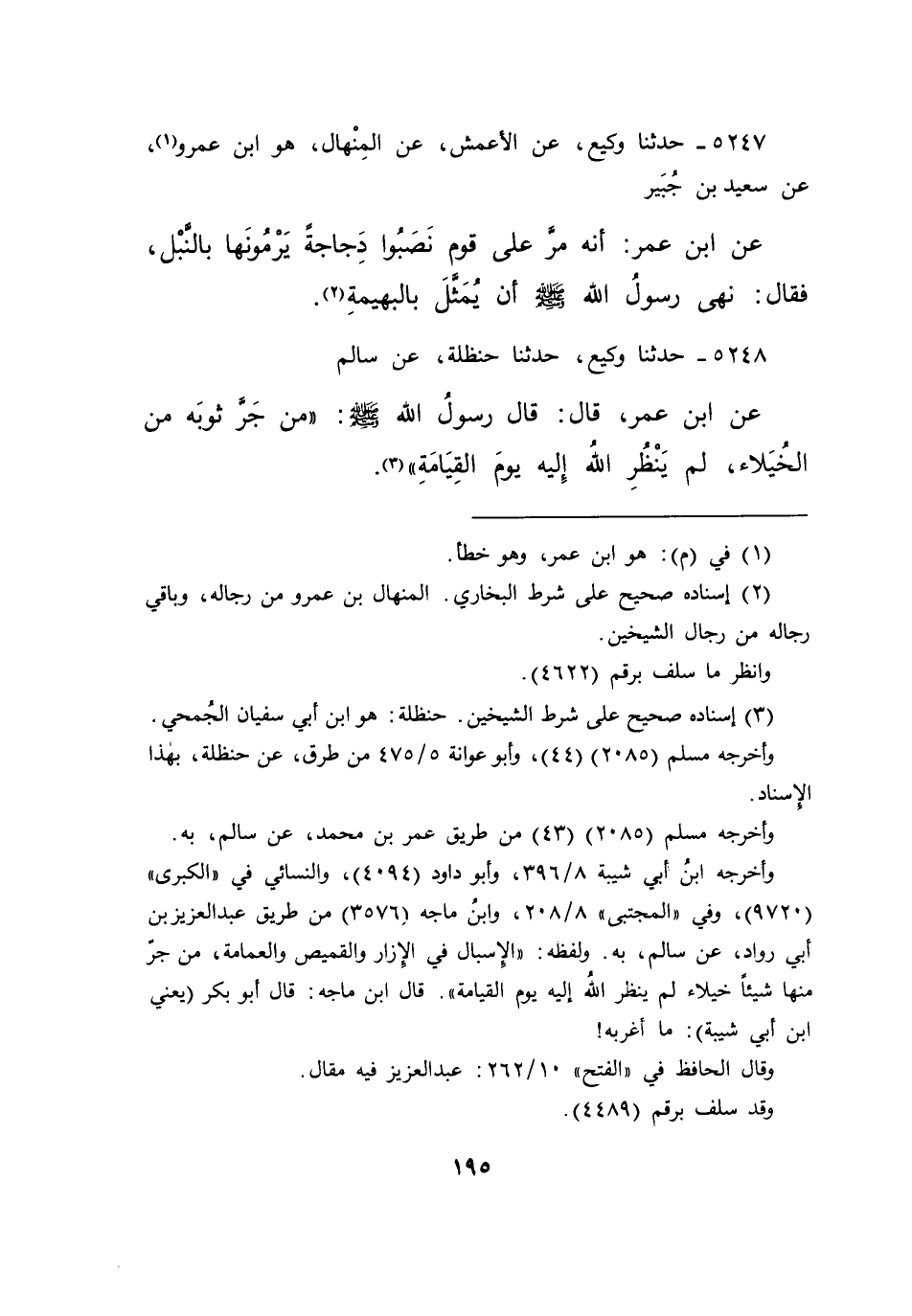 ٥٢٤٨ - حَدَّثَنَا وَكِيعٌ، حَدَّثَنَا حَنْظَلَةُ، عَنْ سَالِمٍ، عَنِ ابْنِ عُمَرَ قَالَ: قَالَ رَسُولُ اللهِ صَلَّى اللهُ عَلَيْهِ وَسَلَّمَ: " مَنْ جَرَّ ثَوْبَهُ مِنَ الْخُيَلَاءِ لَمْ يَنْظُرِ اللهُ إِلَيْهِ يَوْمَ الْقِيَامَةِ " (٣)
