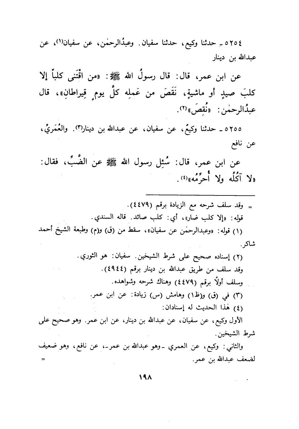 ٥٢٥٤ - حَدَّثَنَا وَكِيعٌ، حَدَّثَنَا سُفْيَانُ، (١) وَعَبْدُ الرَّحْمَنِ، عَنْ سُفْيَانَ، عَنْ عَبْدِ اللهِ بْنِ دِينَارٍ، عَنِ ابْنِ عُمَرَ قَالَ: قَالَ رَسُولُ اللهِ صَلَّى اللهُ عَلَيْهِ وَسَلَّمَ: " مَنِ اقْتَنَى كَلْبًا إِلَّا كَلْبَ صَيْدٍ أَوْ مَاشِيَةٍ، نَقَصَ مِنْ عَمَلِهِ كُلَّ يَوْمٍ قِيرَاطَانِ " قَالَ عَبْدُ الرَّحْمَنِ: " نُقِصَ (٢)