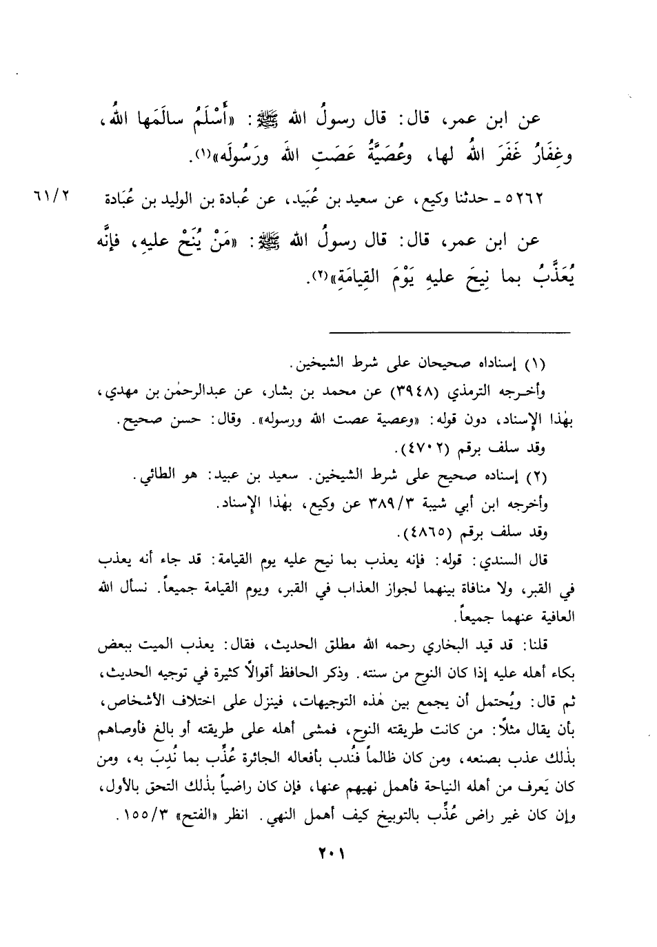 ٥٢٦٢ - حَدَّثَنَا وَكِيعٌ، عَنْ سَعِيدِ بْنِ عُبَيْدٍ، عَنْ عُبَادَةَ بْنِ الْوَلِيدِ بْنِ عُبَادَةَ، عَنِ ابْنِ عُمَرَ قَالَ: قَالَ رَسُولُ اللهِ صَلَّى اللهُ عَلَيْهِ وَسَلَّمَ: " مَنْ يُنَحْ عَلَيْهِ، فَإِنَّهُ يُعَذَّبُ بِمَا نِيحَ عَلَيْهِ يَوْمَ الْقِيَامَةِ " (٢)