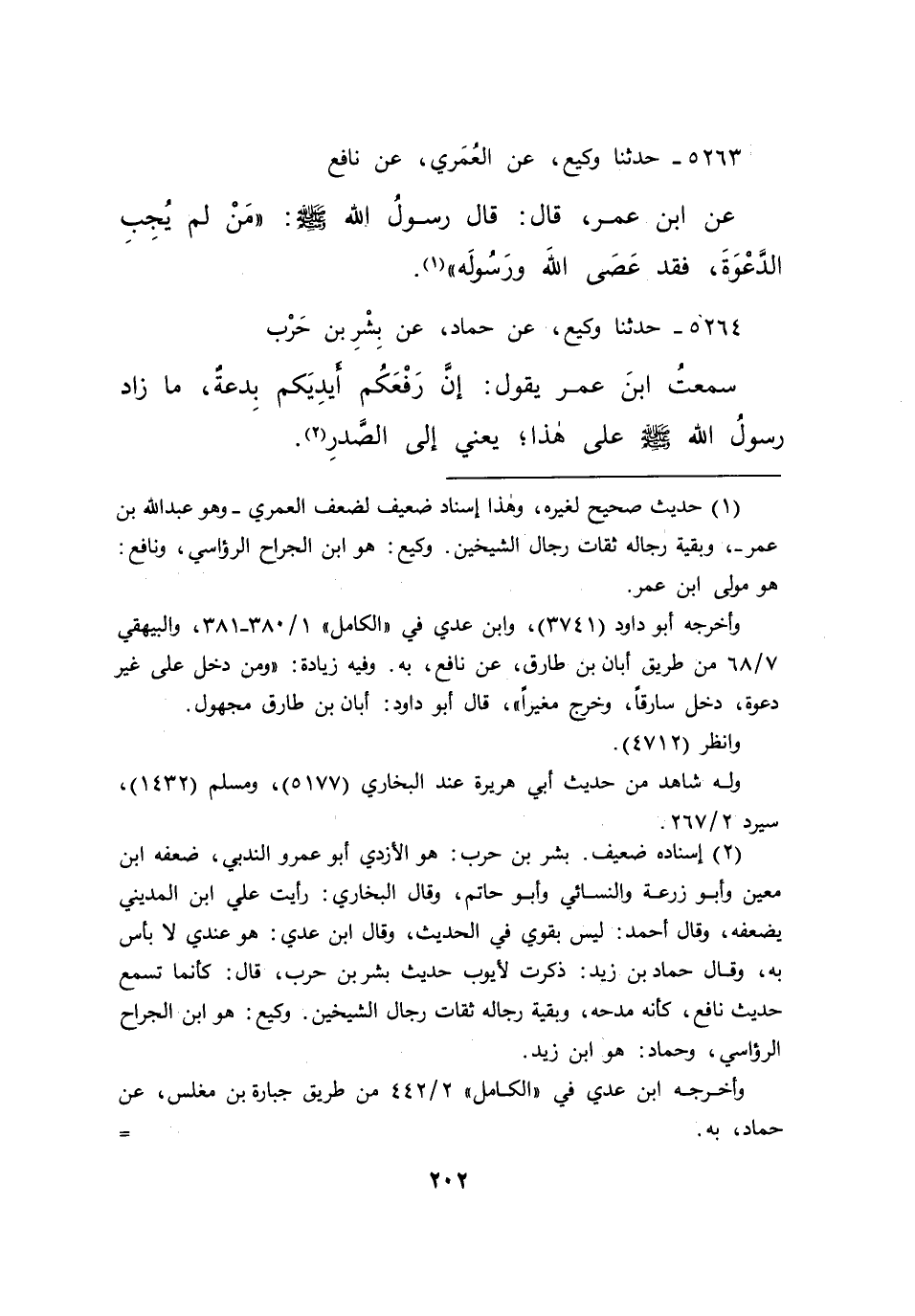 ٥٢٦٣ - حَدَّثَنَا وَكِيعٌ، عَنِ الْعُمَرِيِّ، عَنْ نَافِعٍ، عَنِ ابْنِ عُمَرَ قَالَ: قَالَ رَسُولُ اللهِ صَلَّى اللهُ عَلَيْهِ وَسَلَّمَ: " مَنْ لَمْ يُجِبِ الدَّعْوَةَ فَقَدْ عَصَى اللهَ وَرَسُولَهُ " (١)